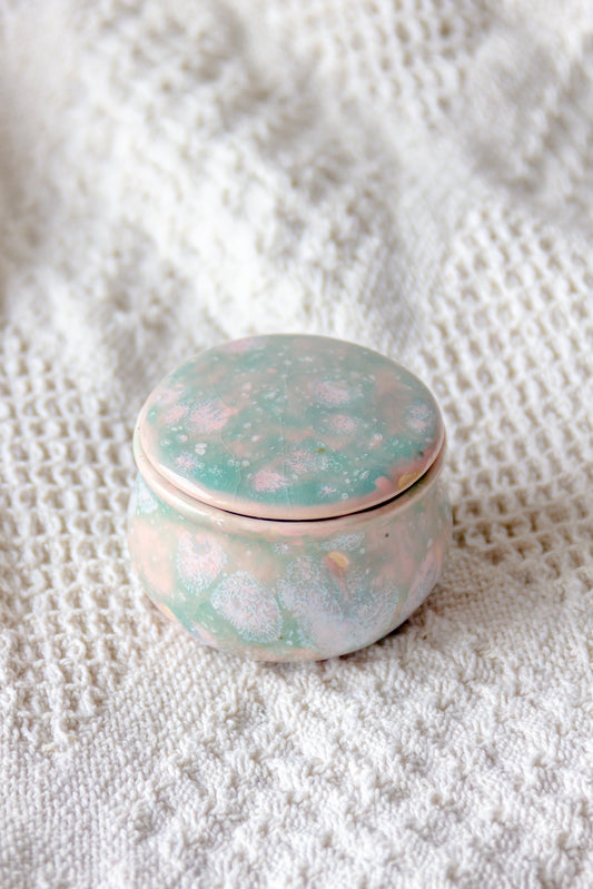Szkatułka ceramiczna zielono-różowa z plamkami mini