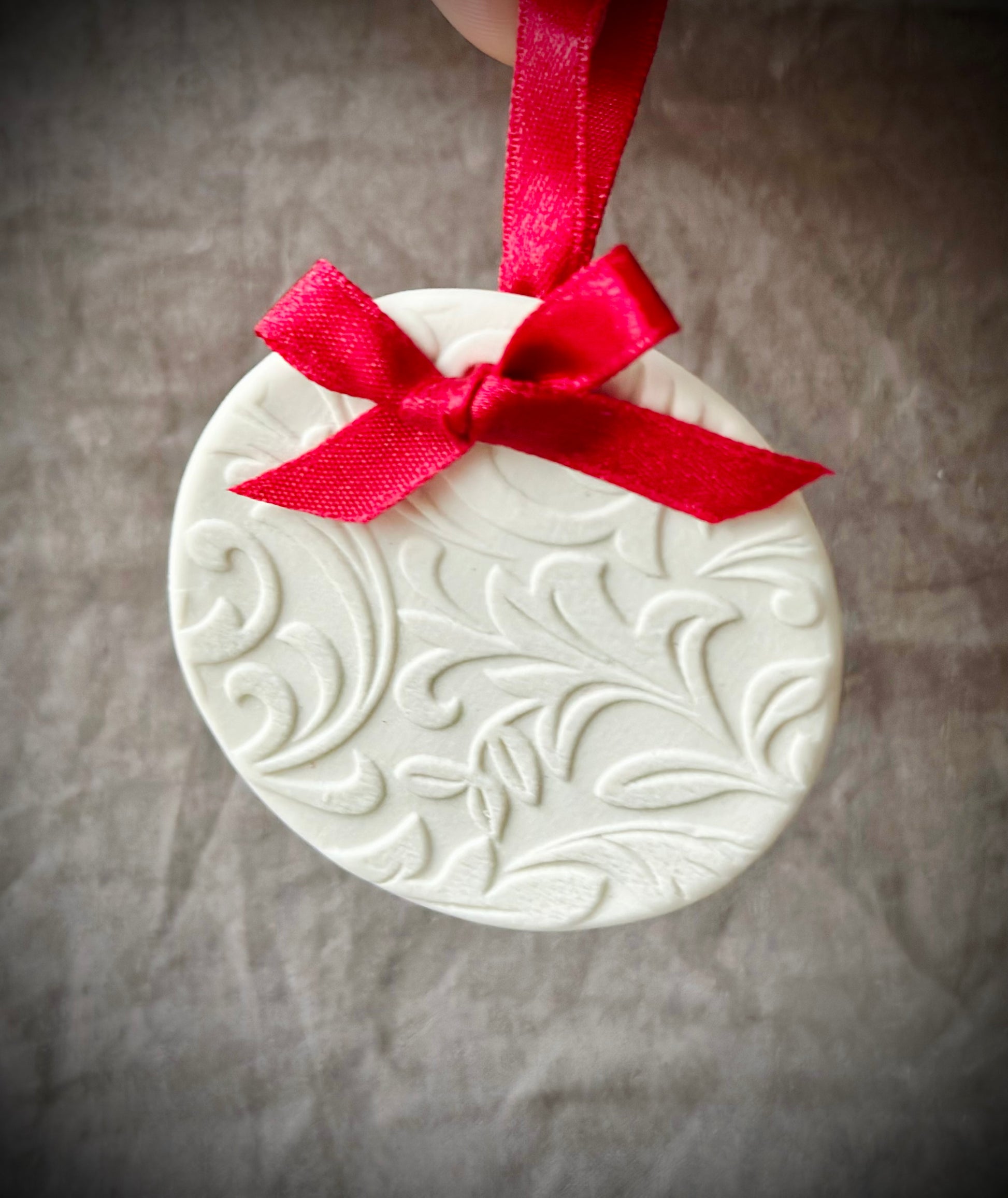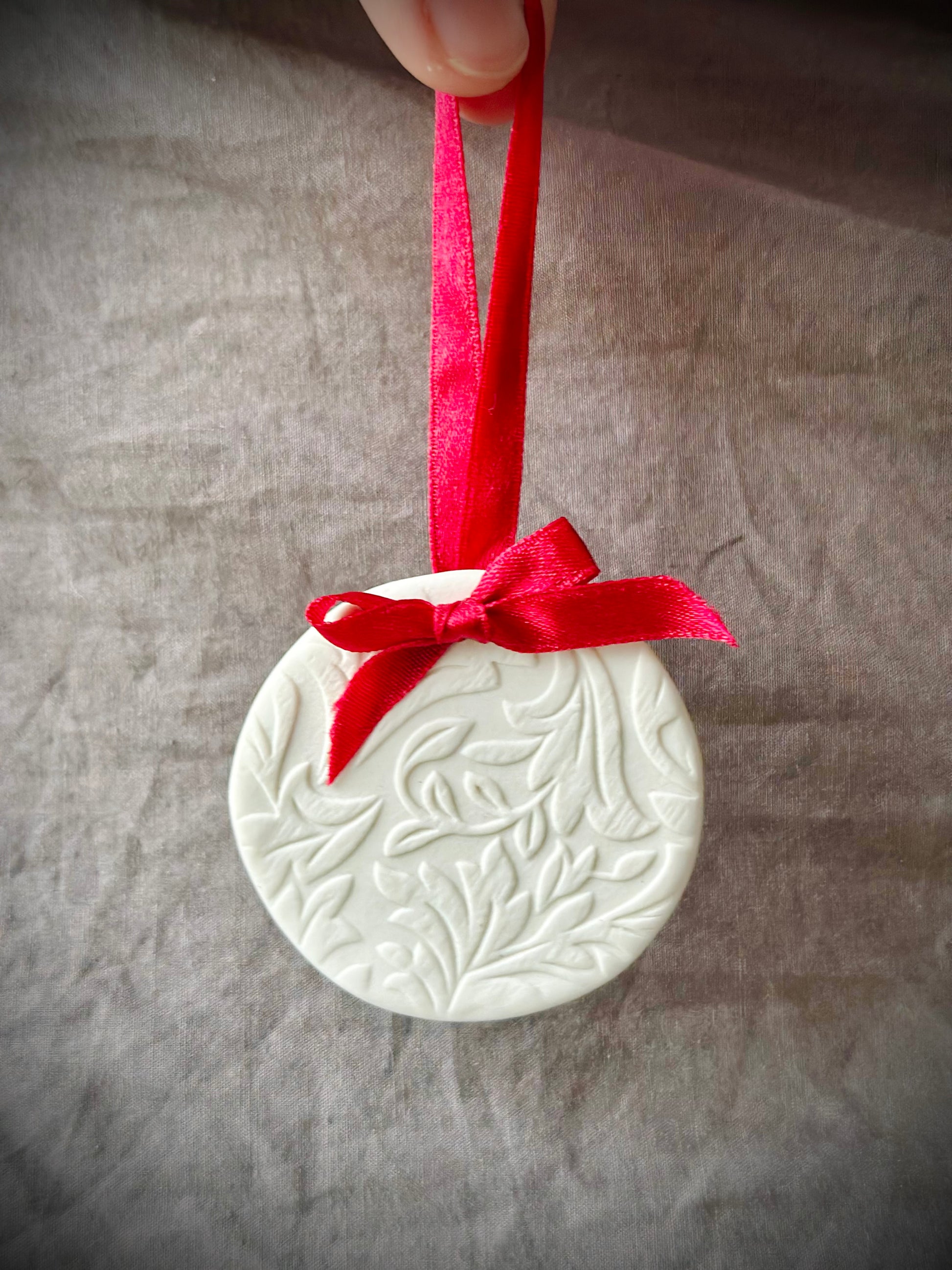 Un pendentif en céramique de Noël unique, fait à la main, plat et rond. Disponible en différents modèles. Le diamètre du pendentif est d'environ 6 cm.