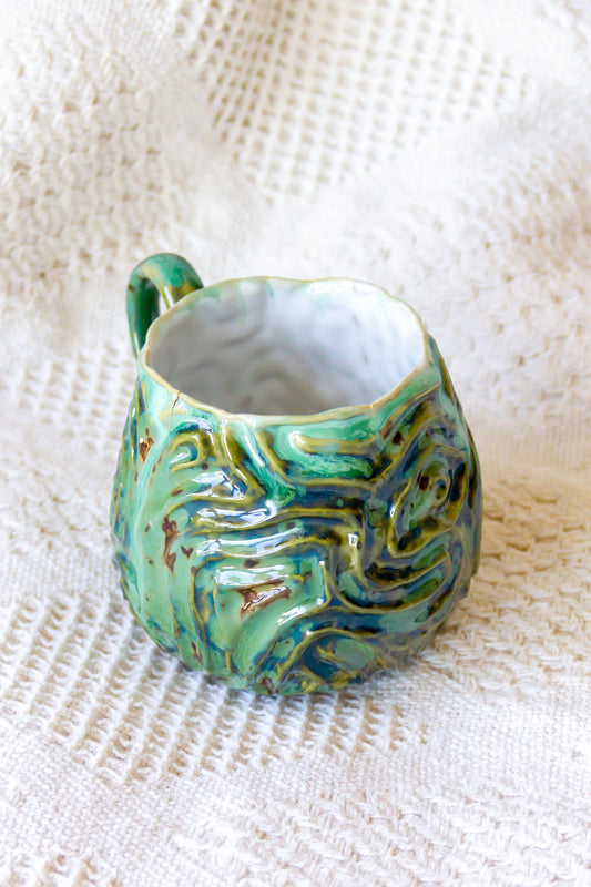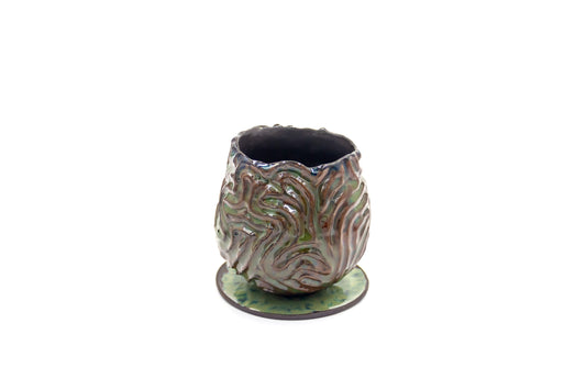Czarka ceramiczna w kolorze zielono-brązowym ze spodkiem