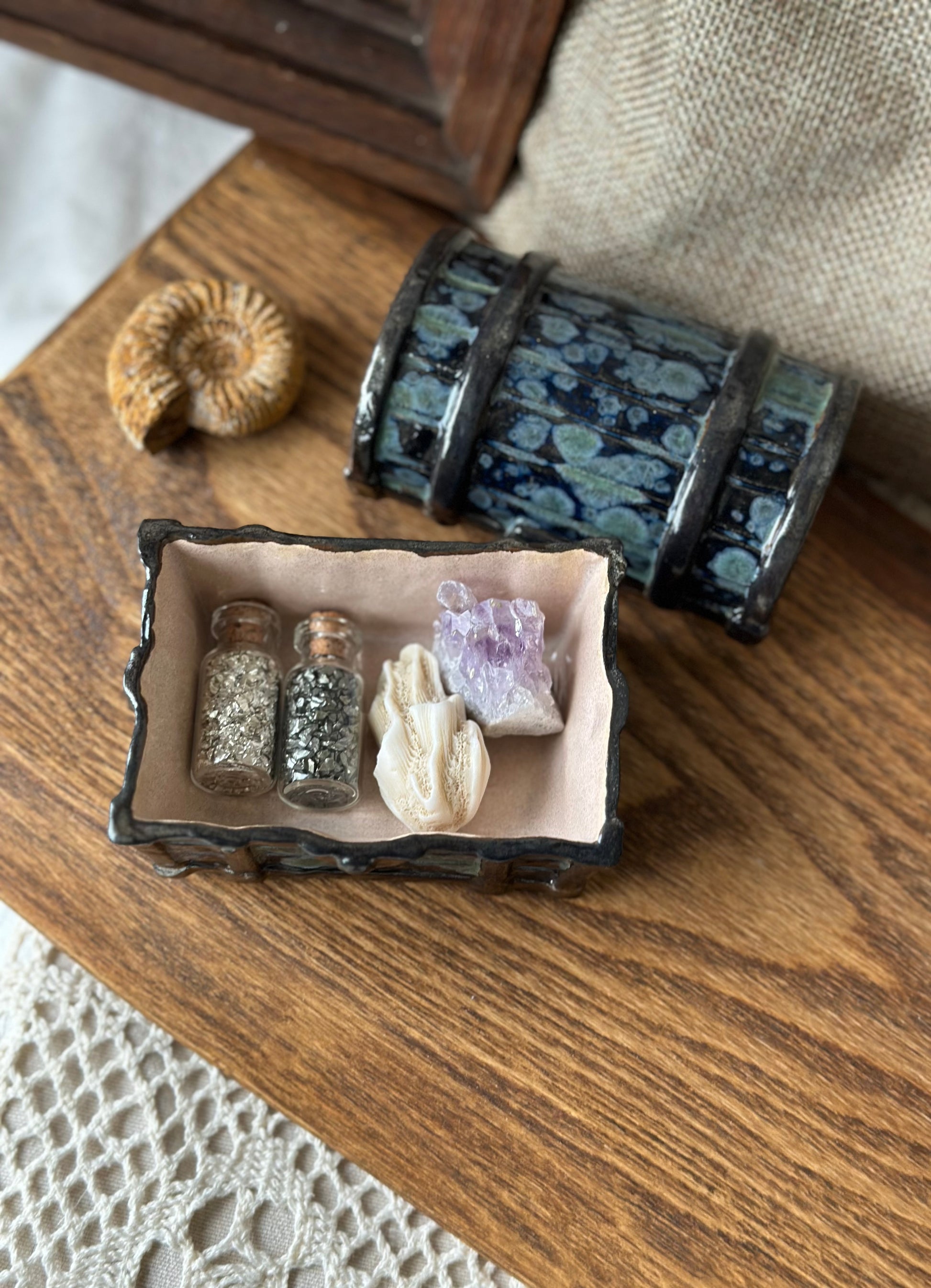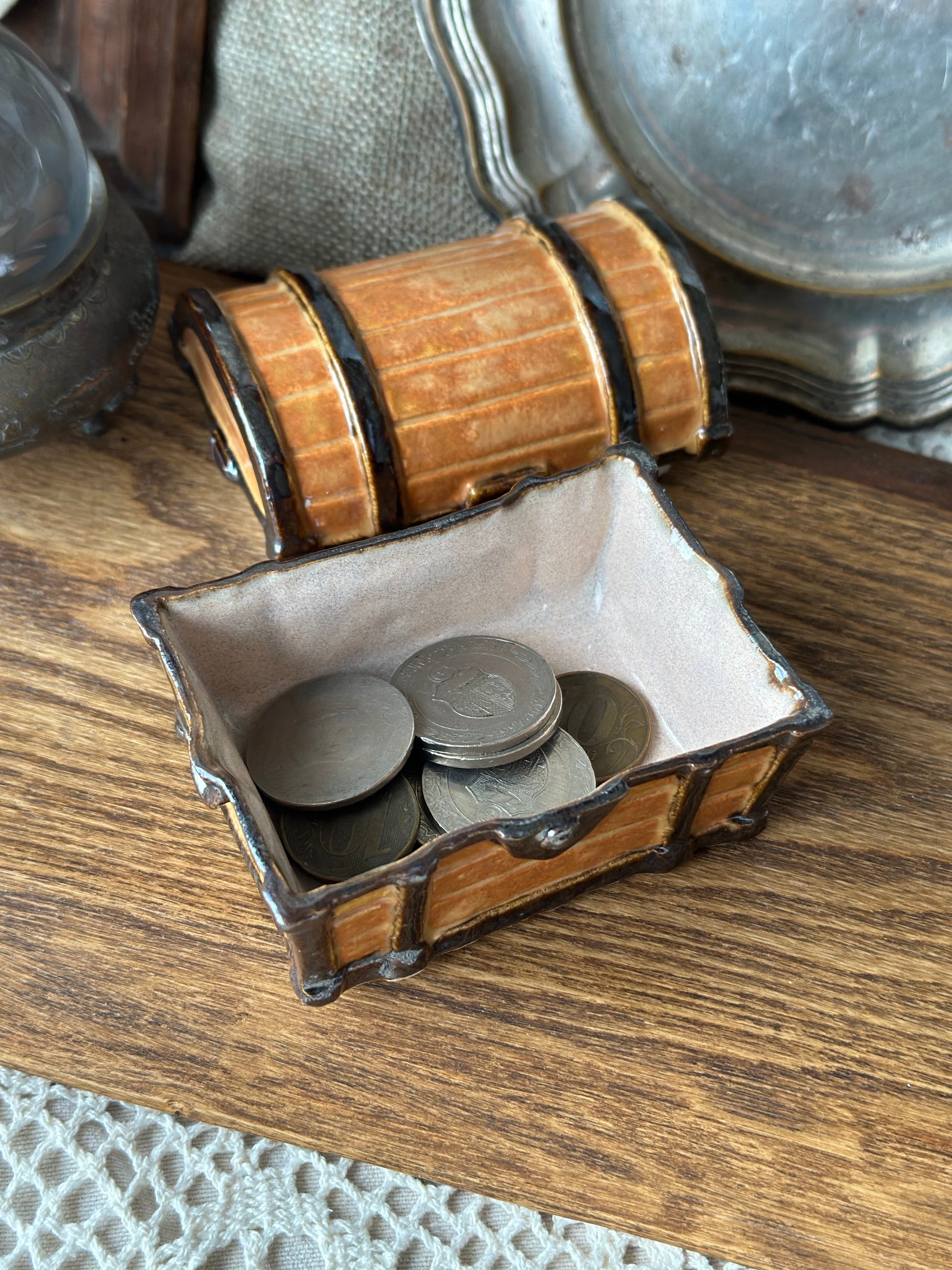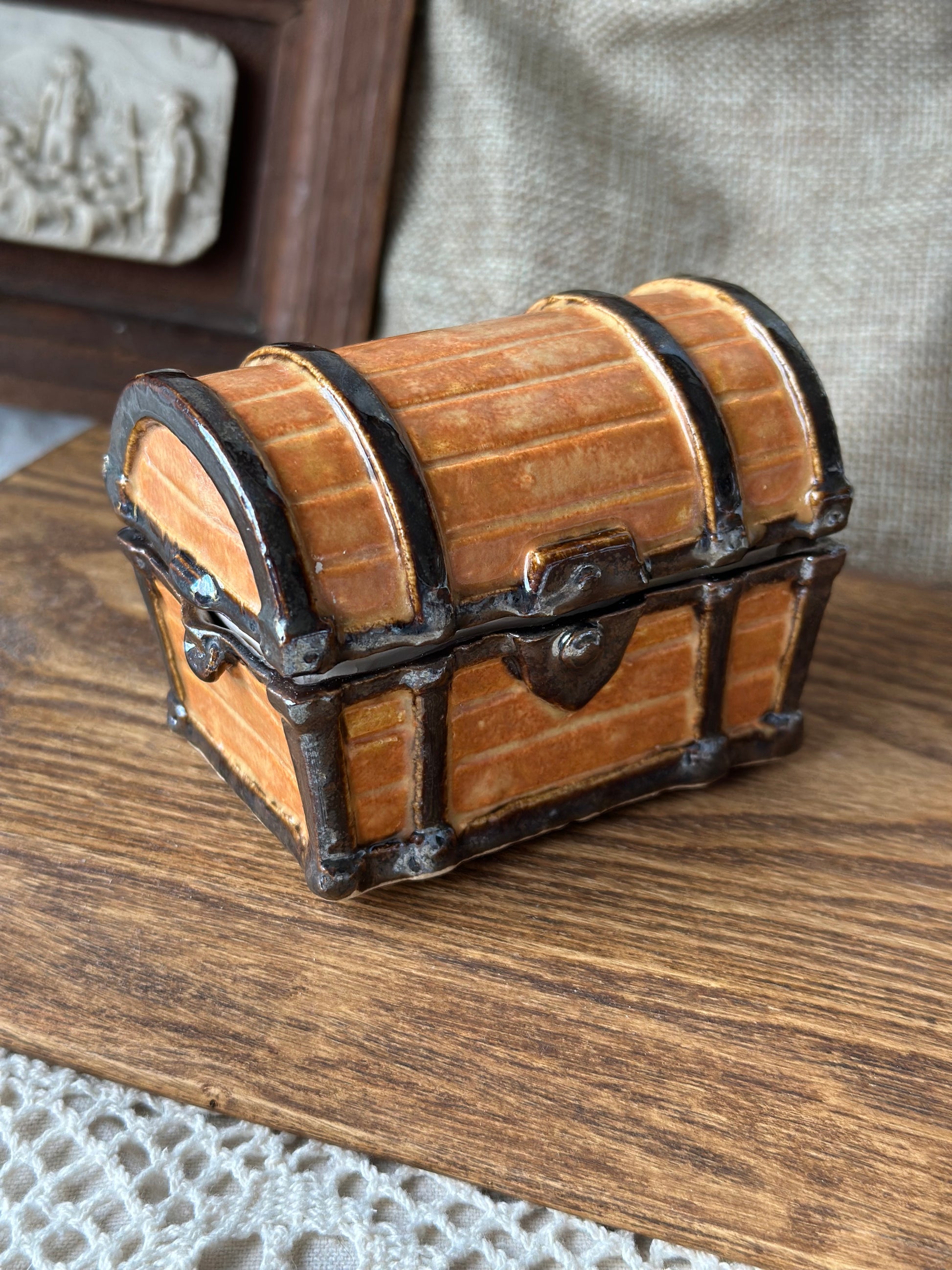Urocza, ręcznie wykonana szkatułka z ceramiki w formie małego kufra. Idealna do przechowywania skarbów.