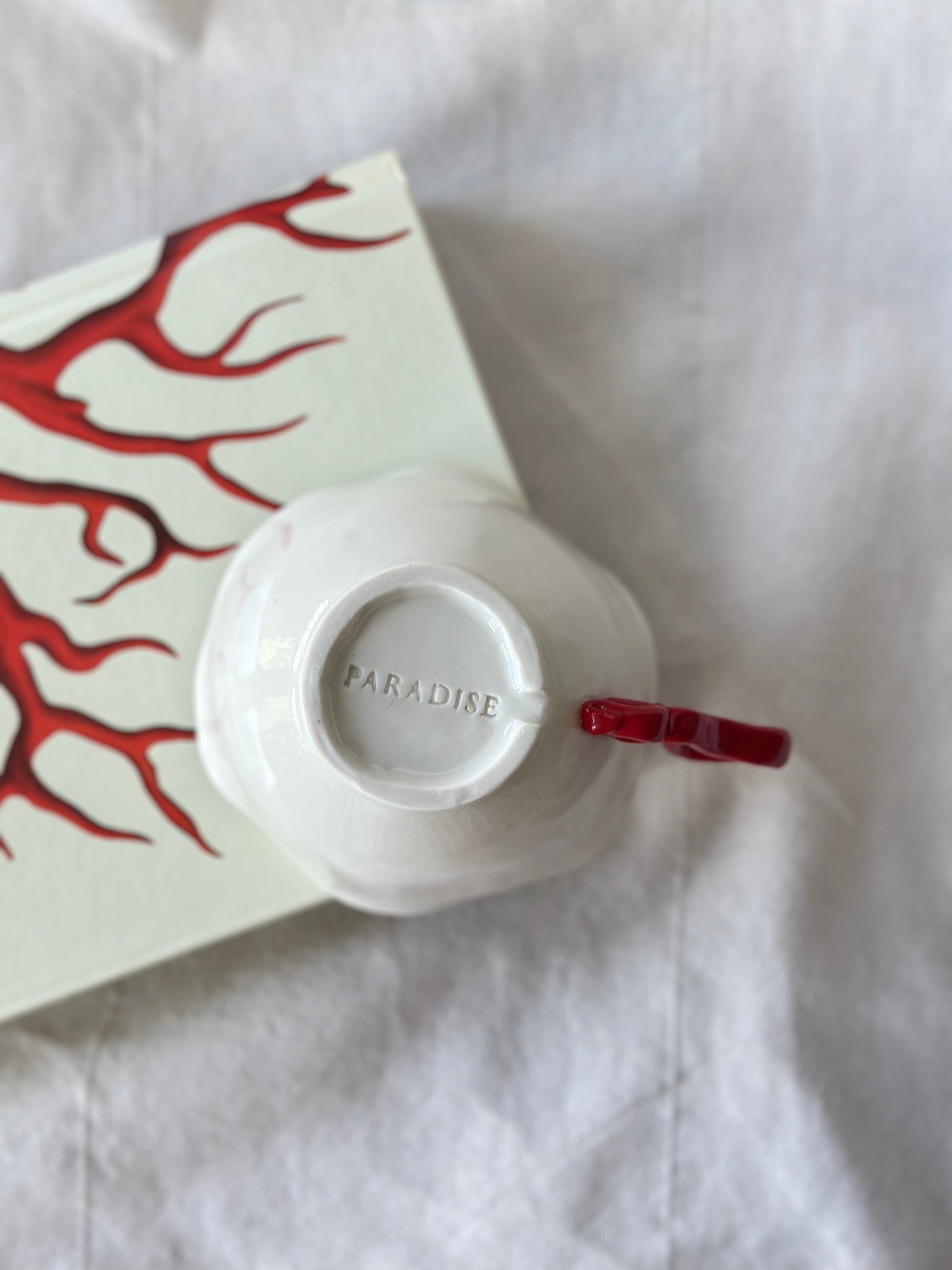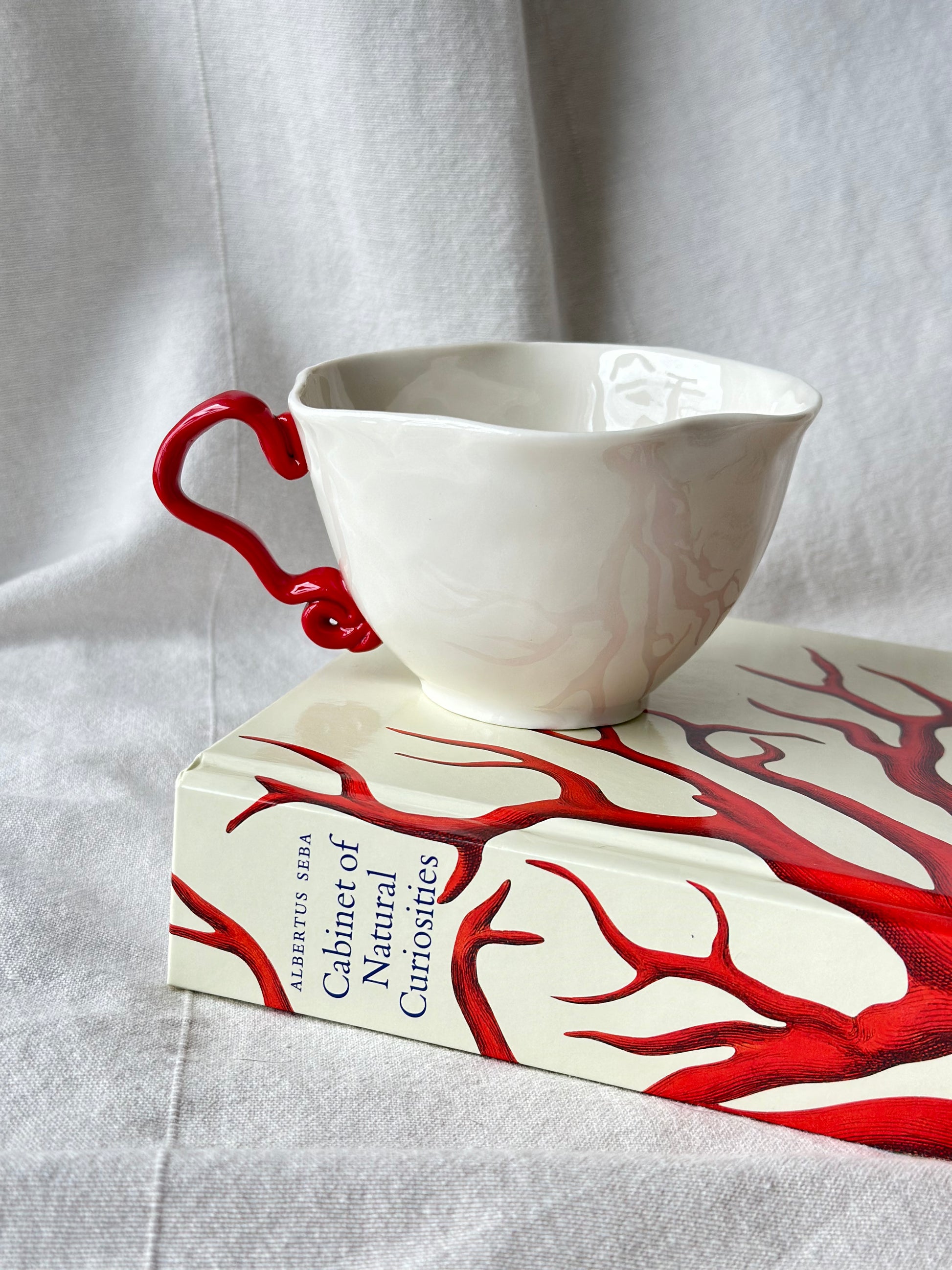Filiżanka porcelanowa z nietypowym uchem czerwonym