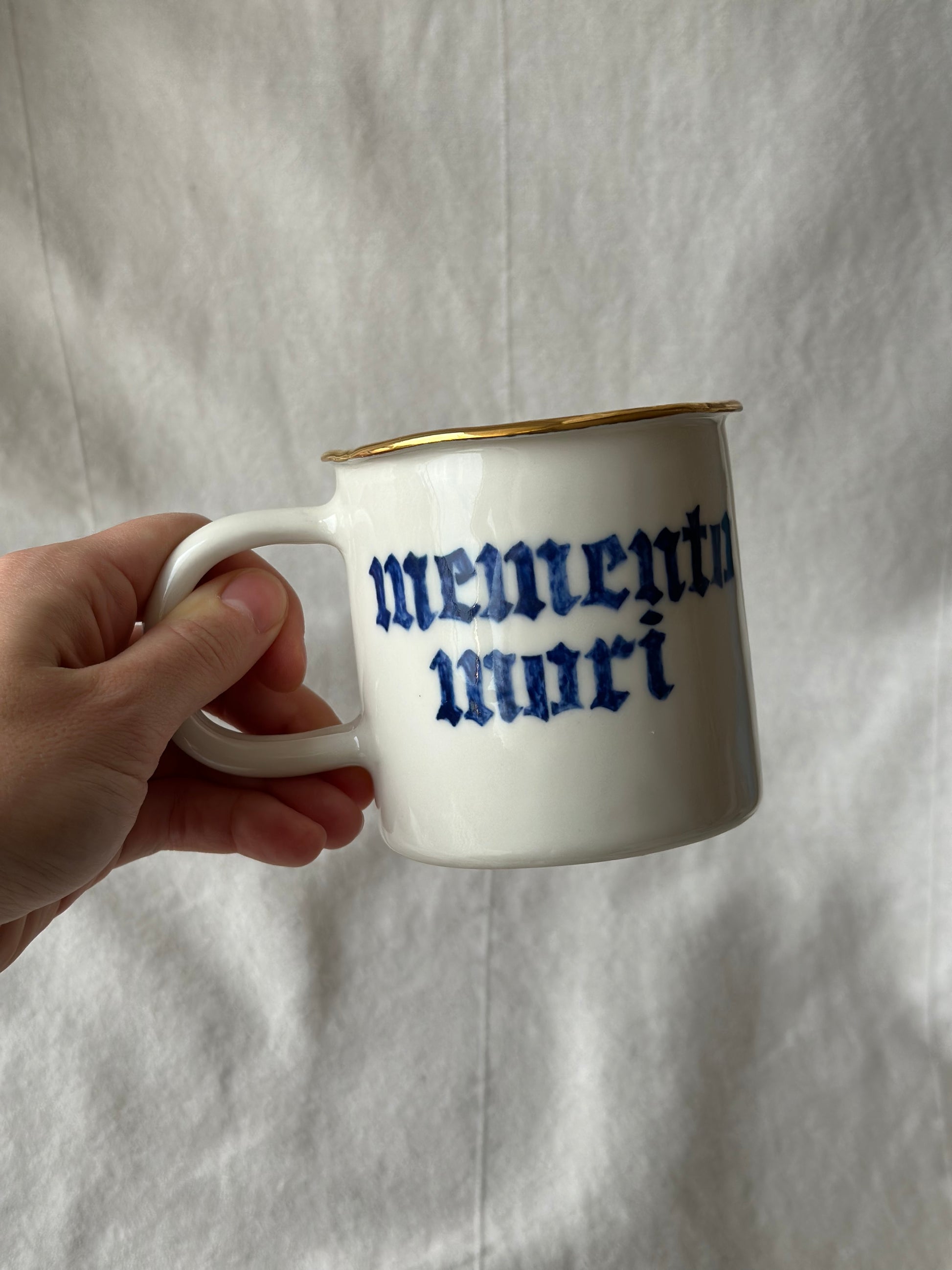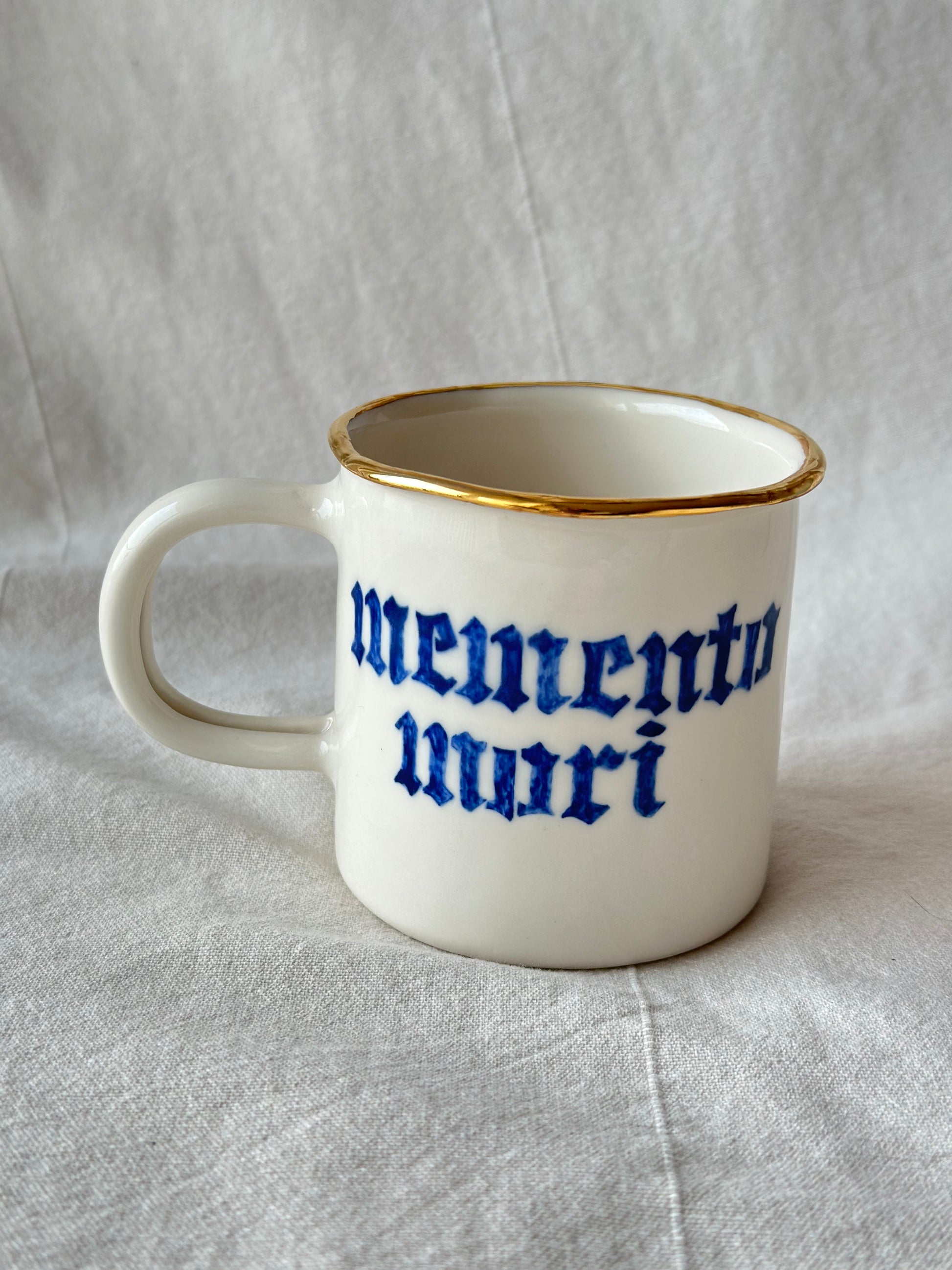Piękny, ręcznie robiony porcelanowy kubek z odręcznym napisem gotycką czcionką „memento mori”.