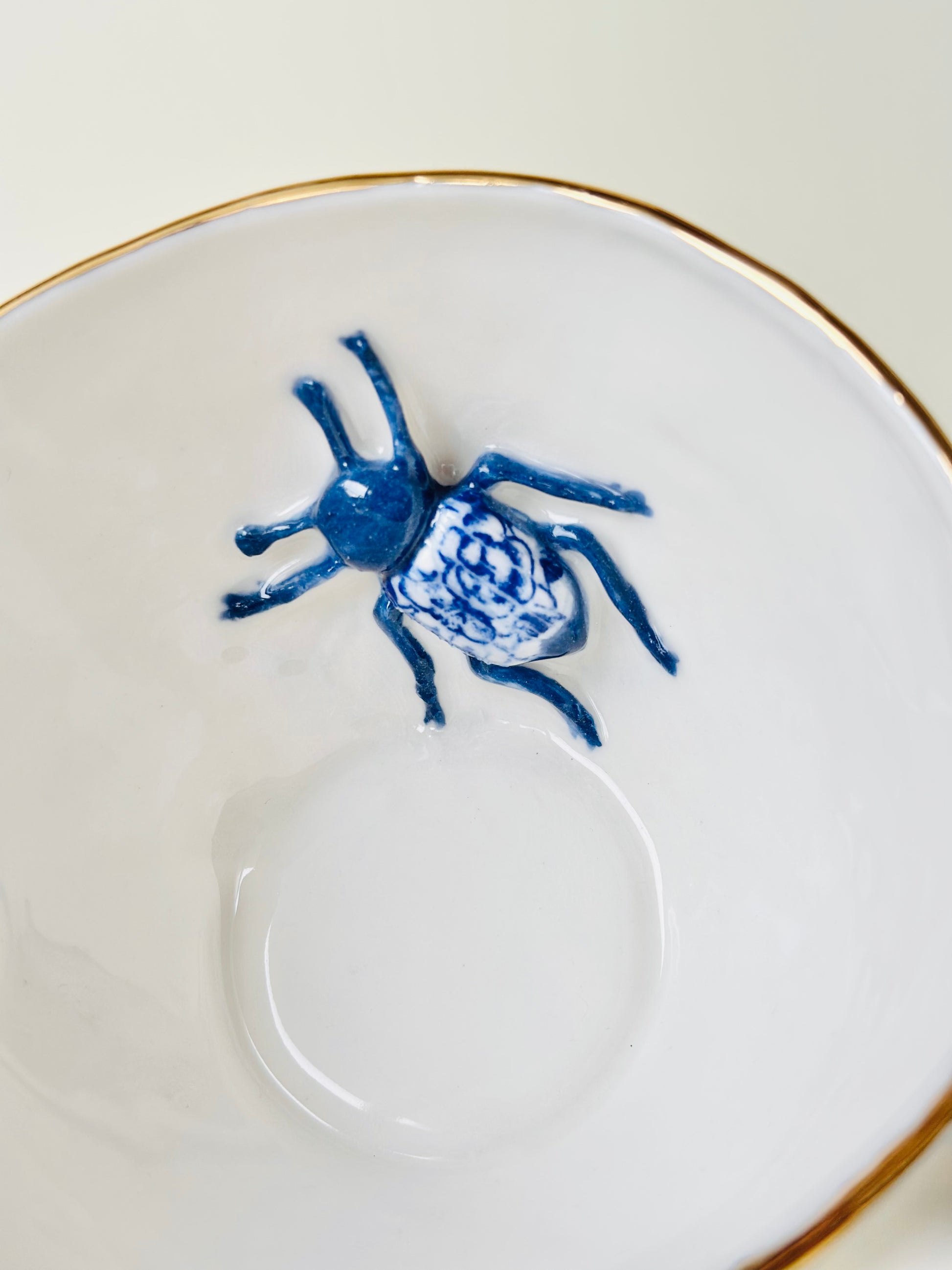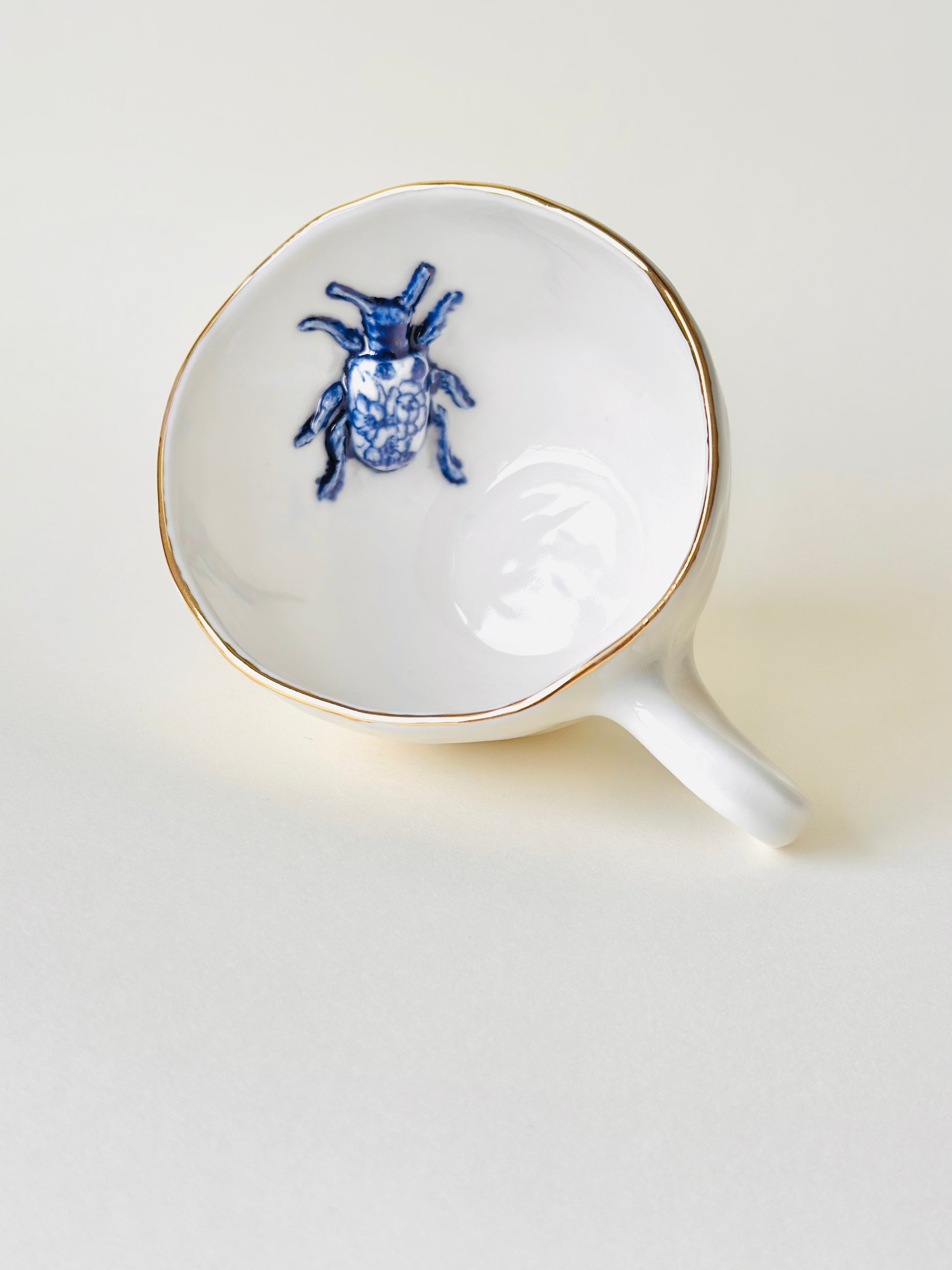 Ręcznie robiona porcelanowa filiżanka z dekoracją w postaci figurki żuka umieszczonej w środku naczynia. Rant ozdobiony złotem. Ze względu na złoto nie zalecane jest mycie w zmywarce oraz podgrzewanie w mikrofalówce.