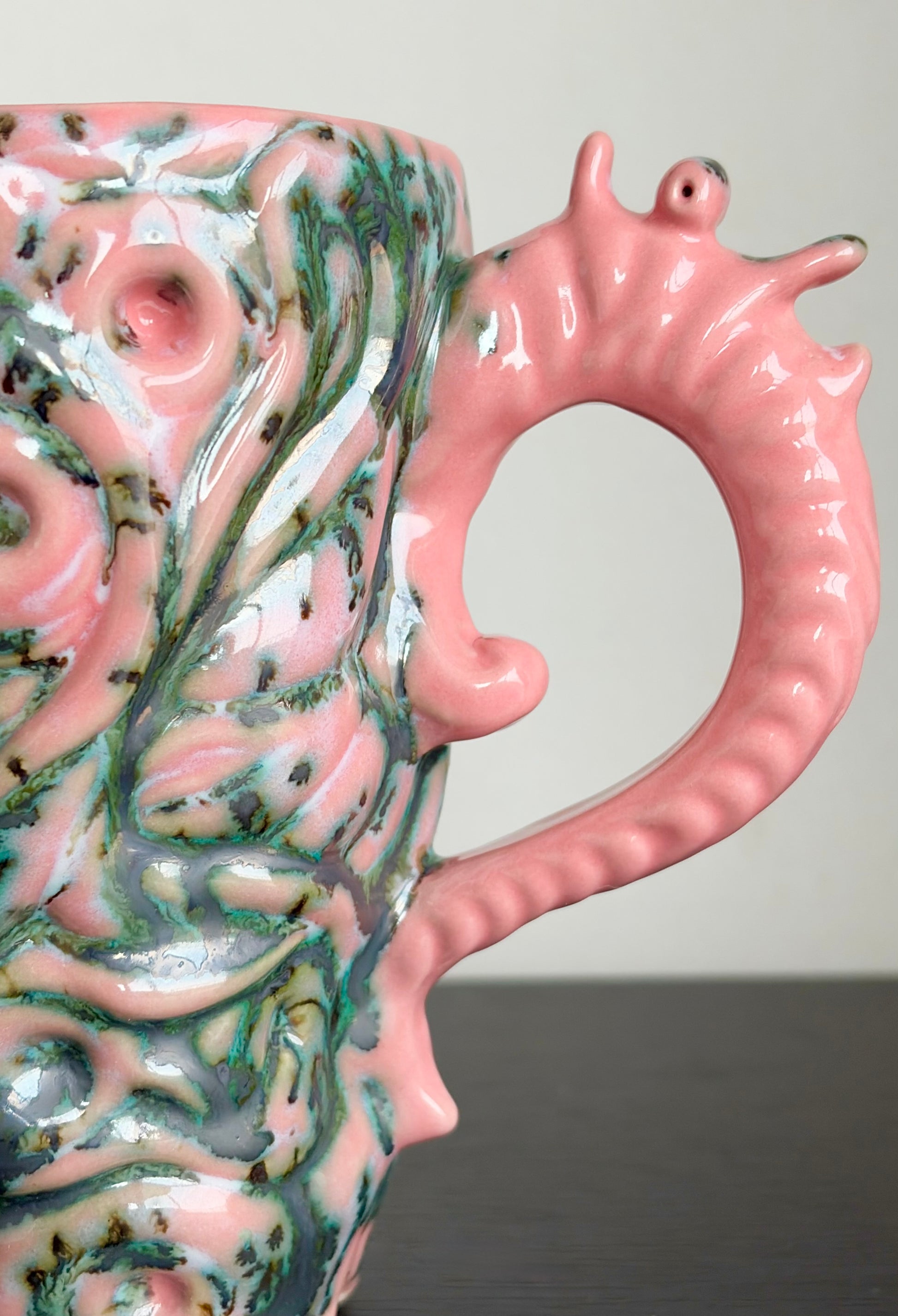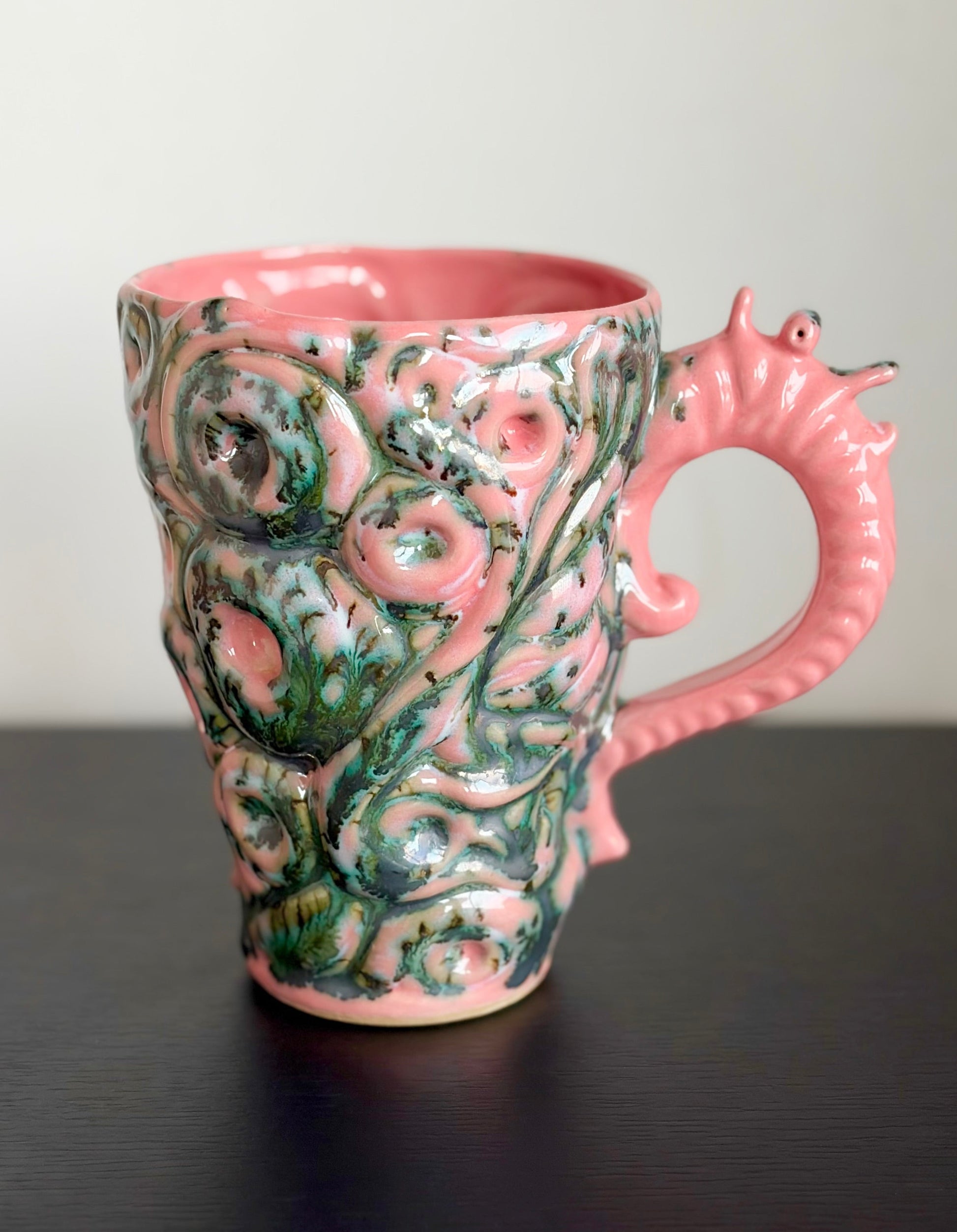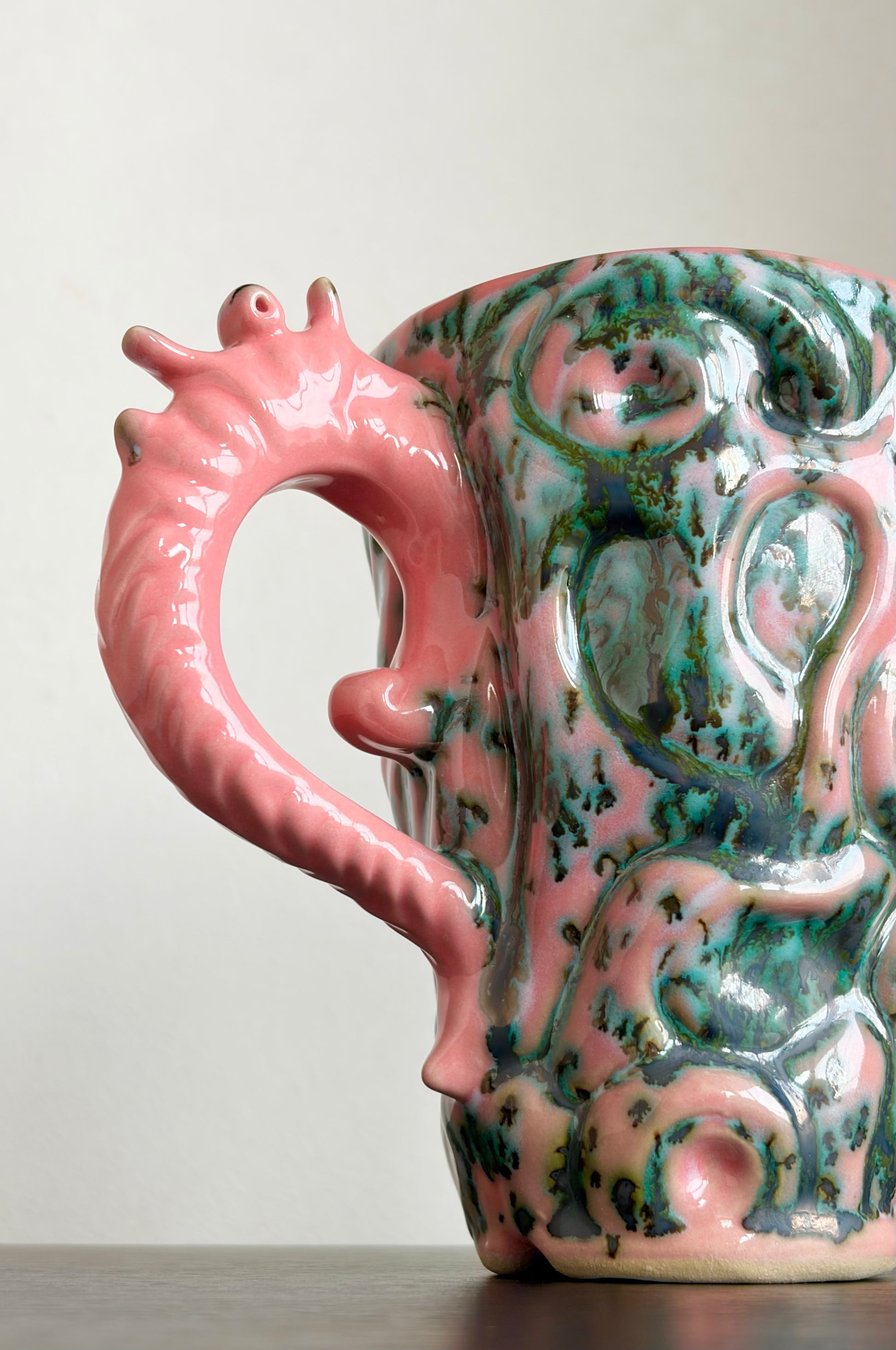Rzeźbiarski kubek o organicznej, lekko falującej formie, pokryty intensywnym różowym szkliwem z mocnymi zielonymi nakropieniami. Powierzchnię zdobią miękkie, reliefowe motywy przypominające krople i wiry. Ucho o fantazyjnym, niemal roślinnym kształcie podkreśla jego unikatowy, artystyczny charakter – jakby nie z tej planety lub przywieziony z przyszłości.