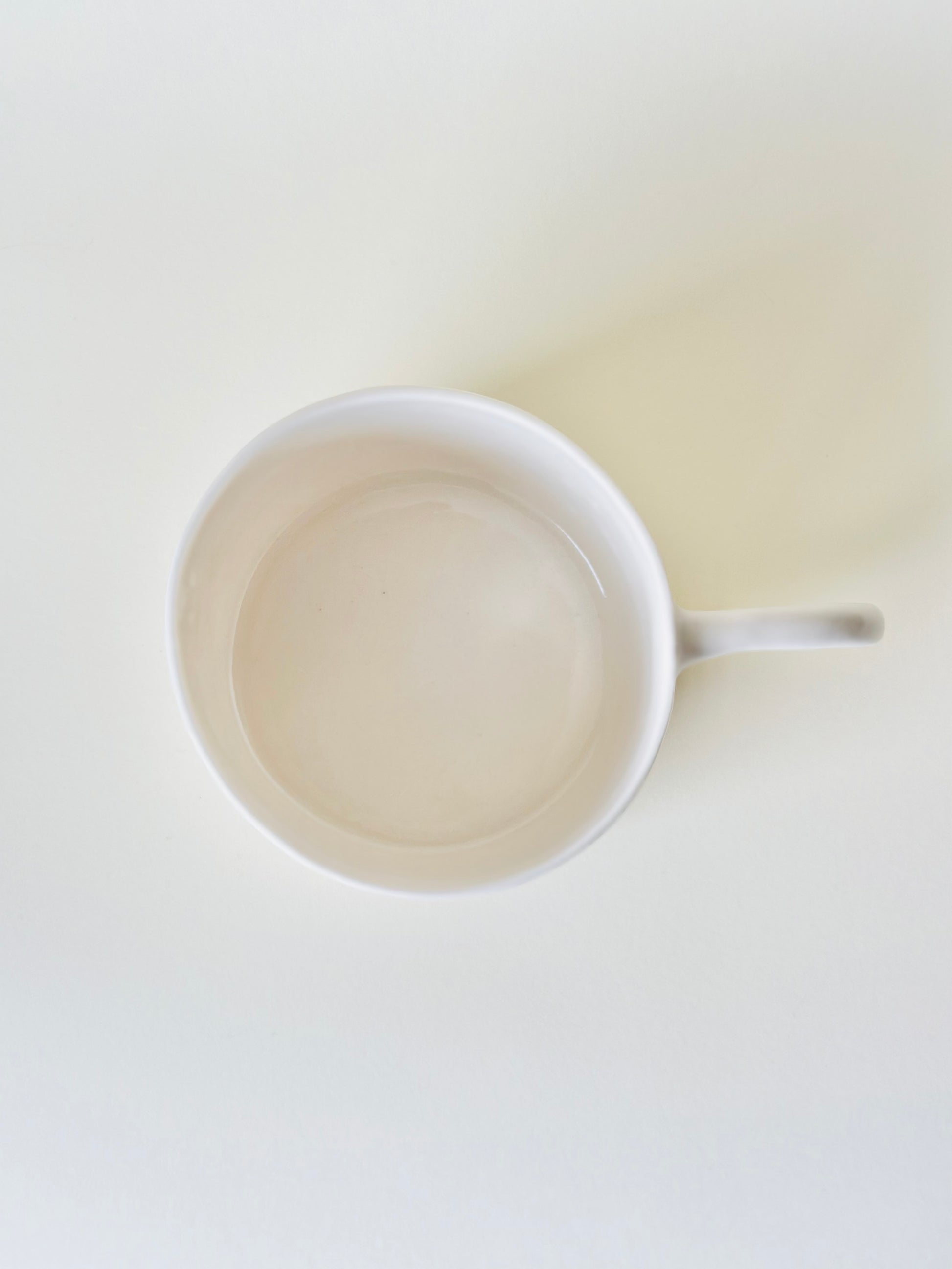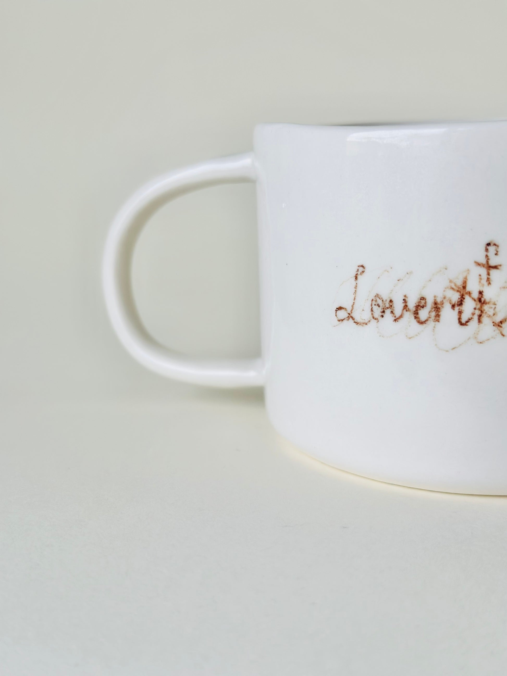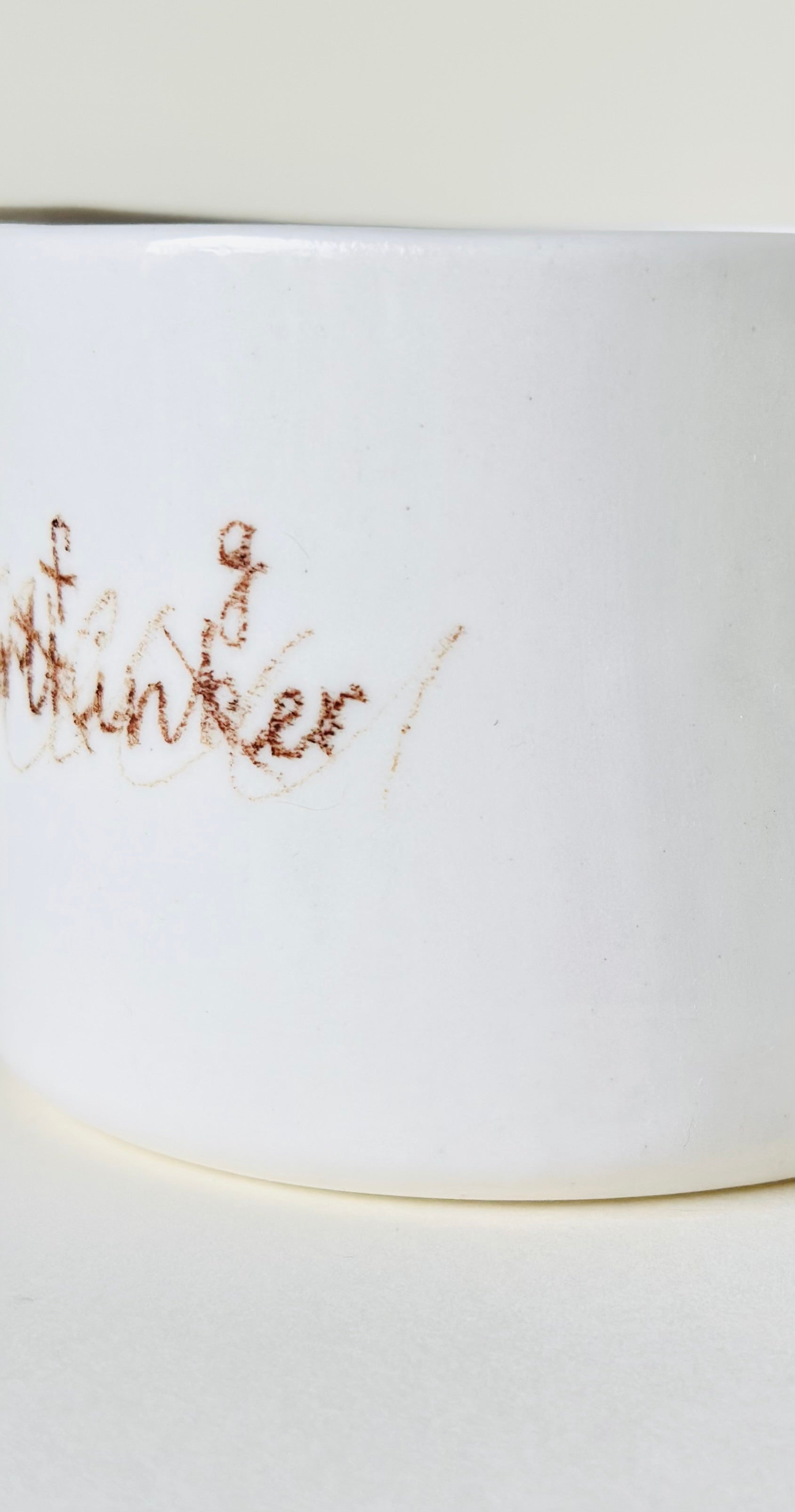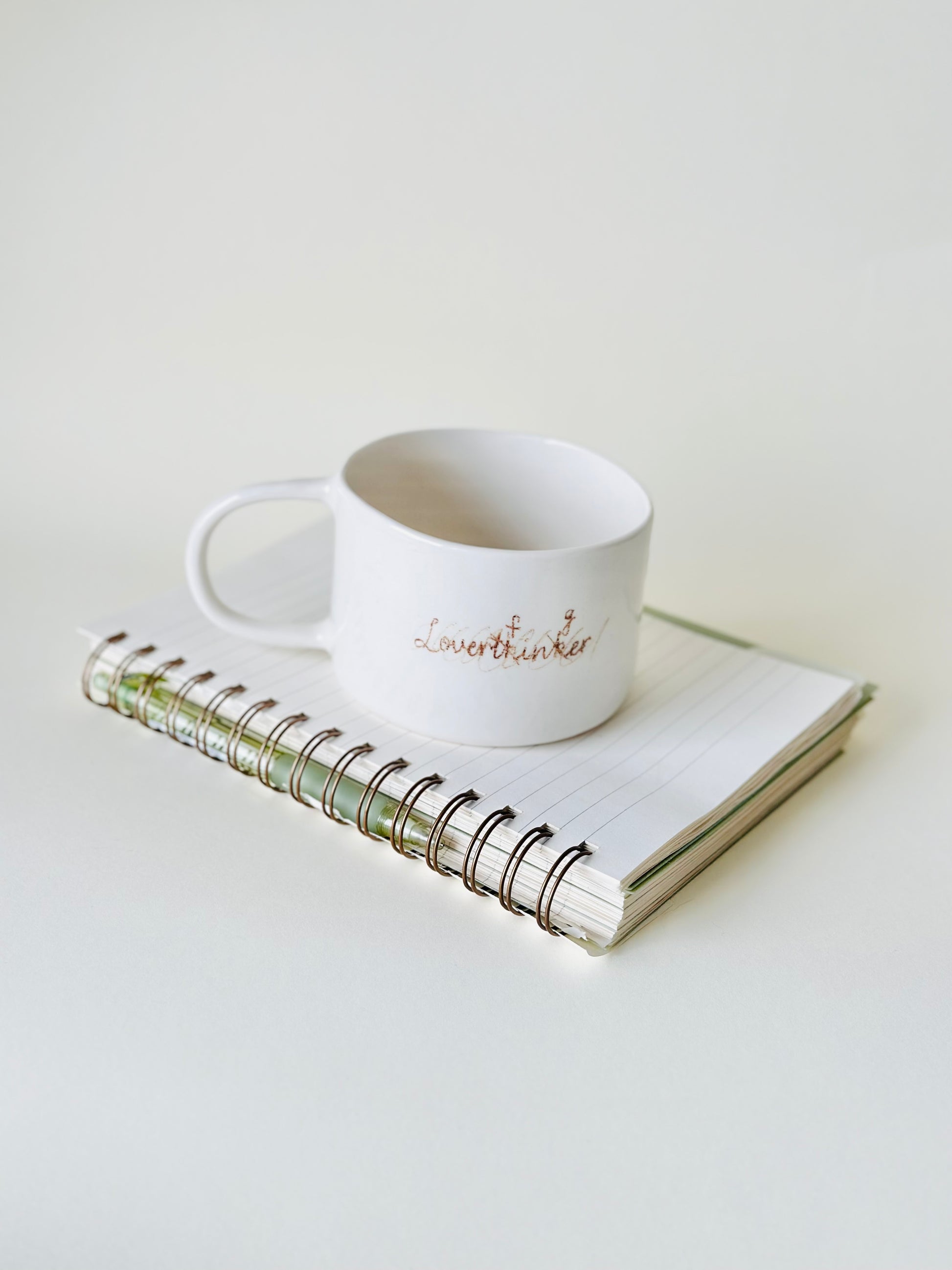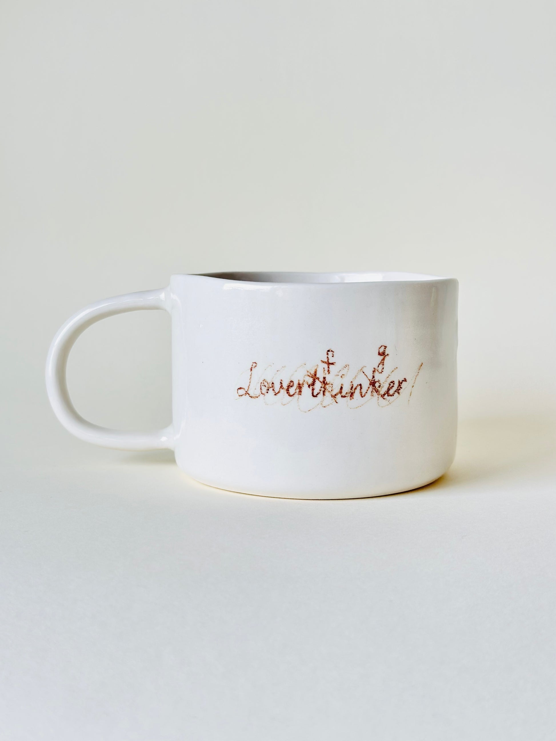 Ręcznie wykonany kubek porcelanowy z napisem „overthinker”, który kolejno został przerobiony na „Loverthinker”, a następnie na „Loverfinger”. To swobodna ilustracja pokazująca, w jaki sposób potrafi działać umysł osoby skłonnej do overthinkingu.