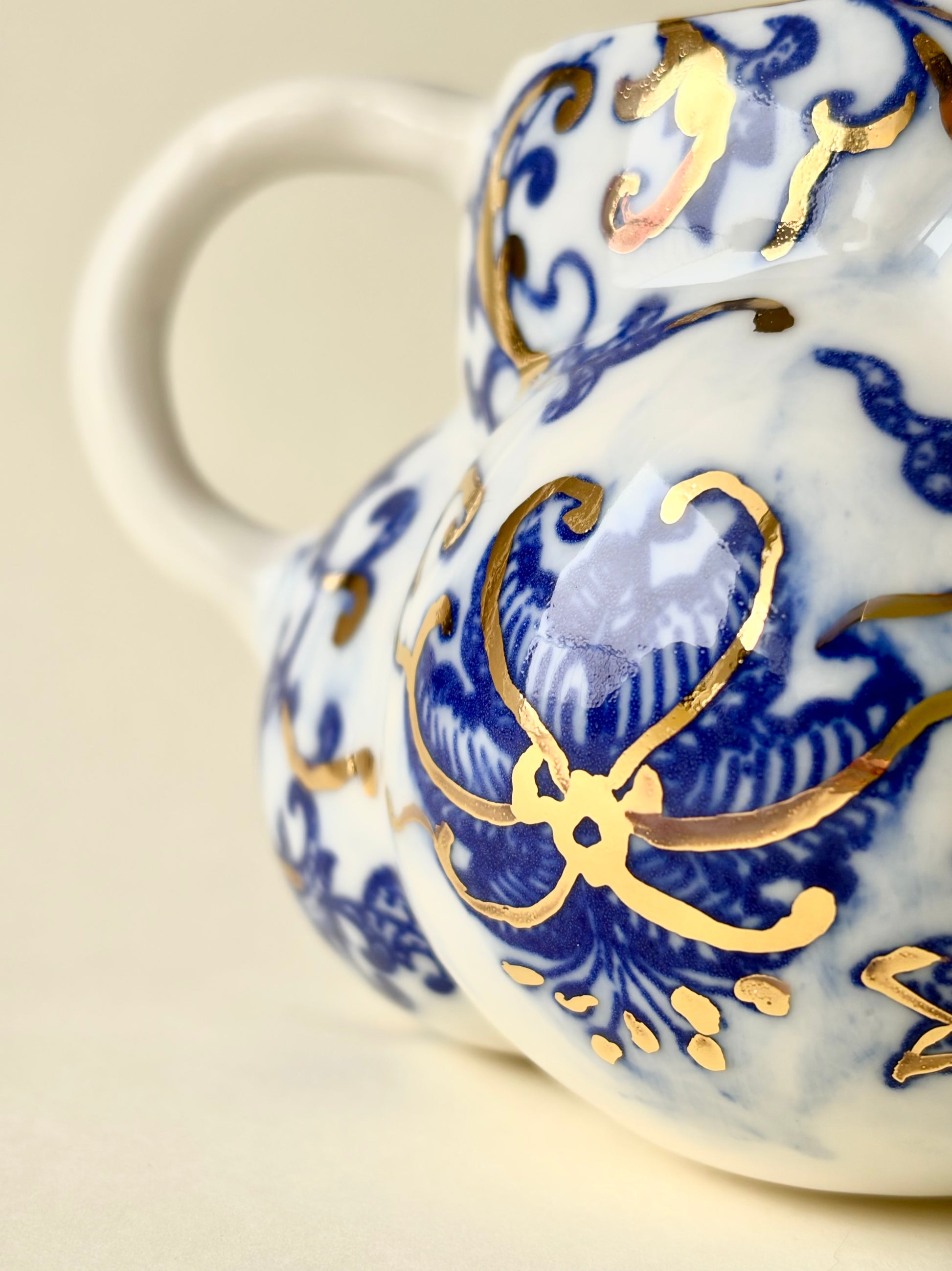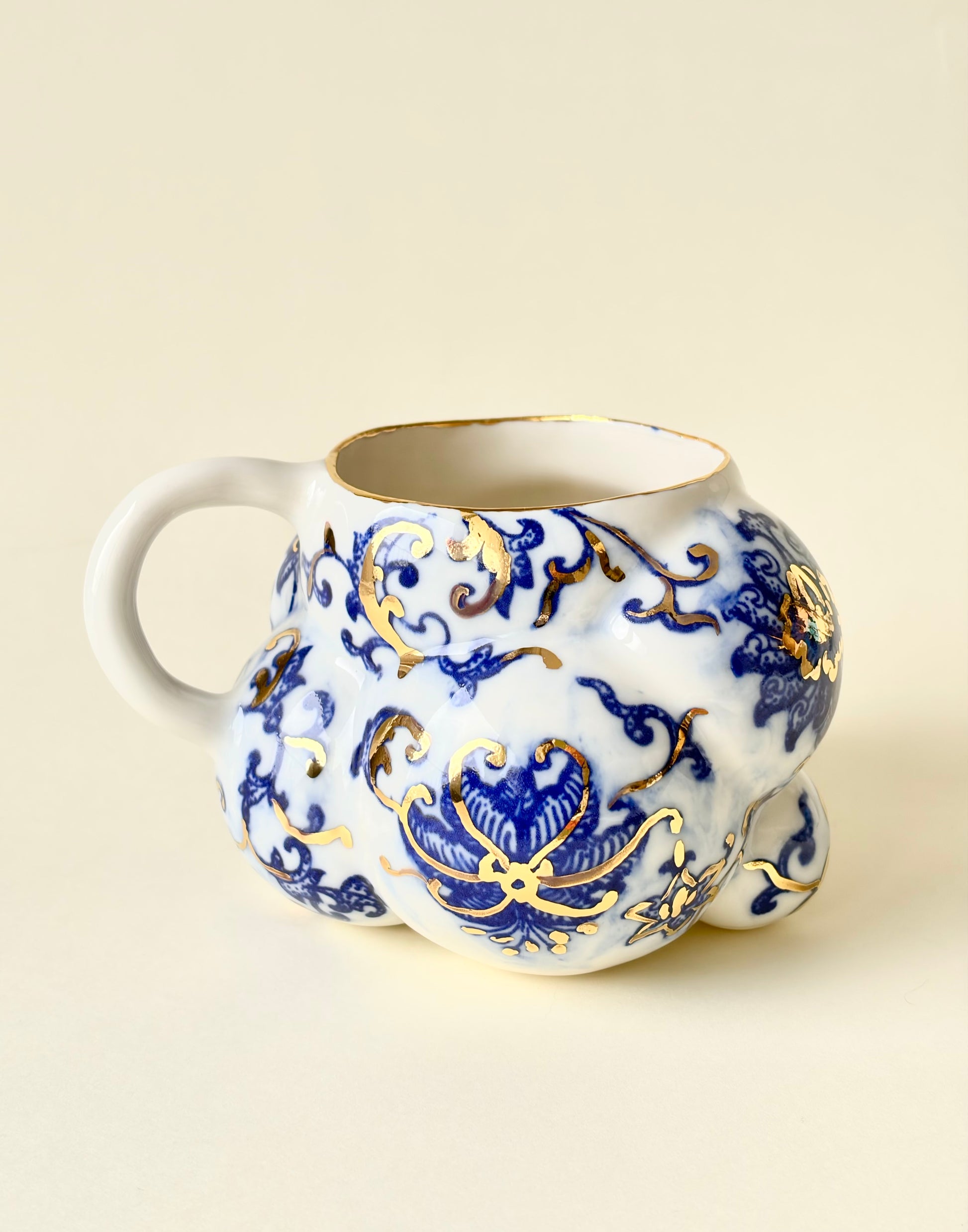 Ręcznie wykonany kubek o rzeźbiarskiej, organicznej formie, inspirowany klasyczną porcelaną. Zdobiony delikatnymi, kobaltowymi motywami roślinnymi oraz subtelnymi złoceniami, wykończony złotą krawędzią. Elegancki i unikatowy, łączy tradycyjną dekoracyjność z nowoczesną formą.