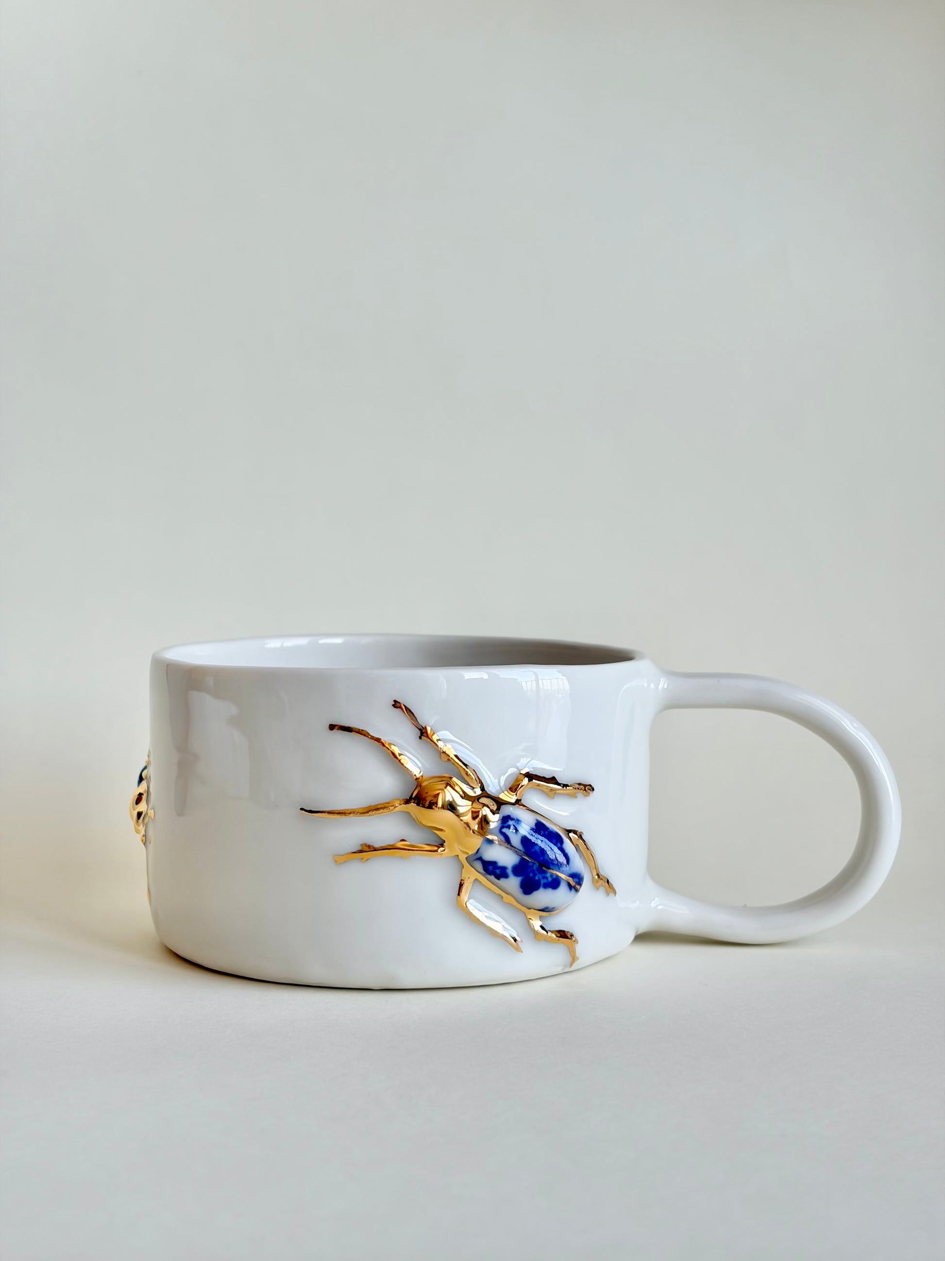 Unikalny ręcznie robiony kubek wykonany z białej porcelany, ozdobiony reliefami żuków. Ciała owadów pokryte są kobaltowymi wzorami inspirowanymi tradycyjną porcelaną, a ich złocone odnóża dodają elegancji i blasku.