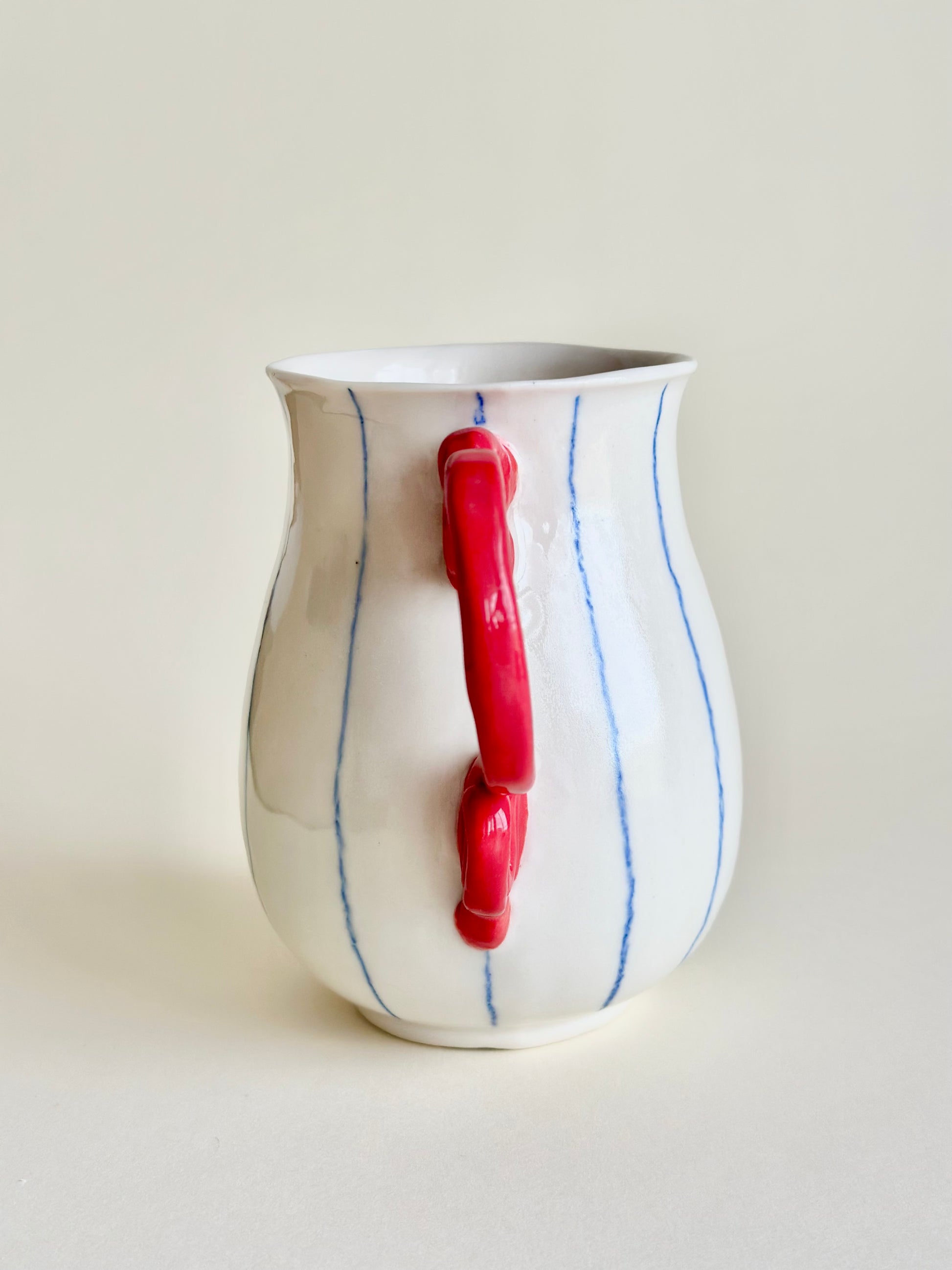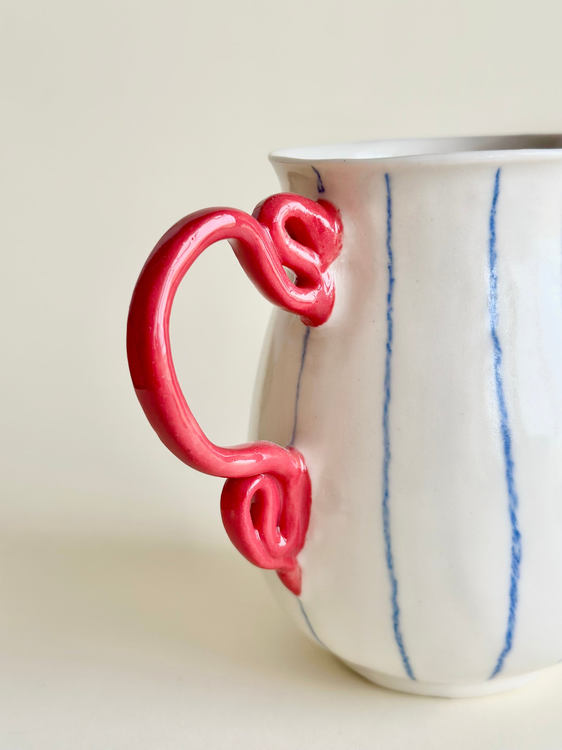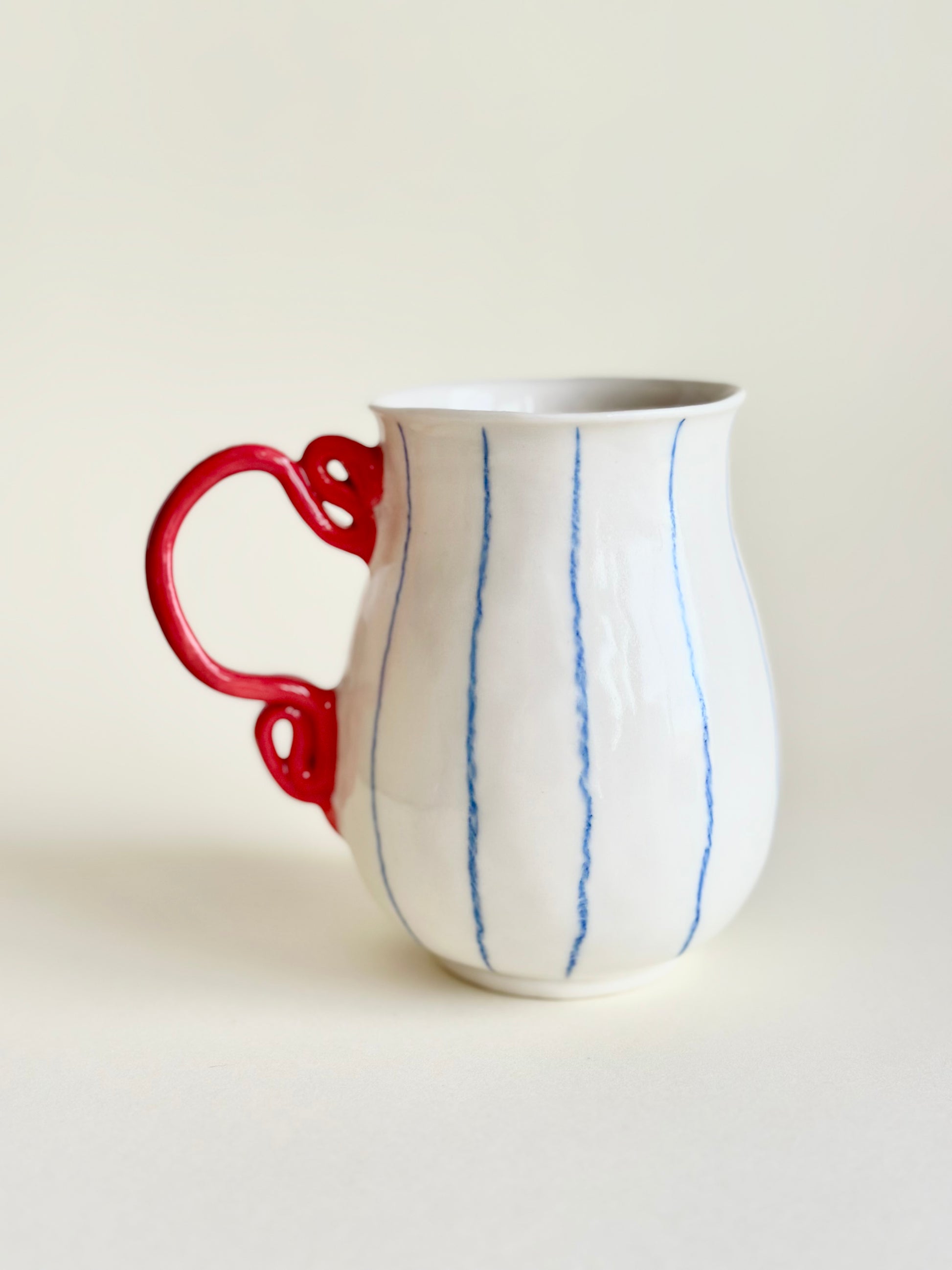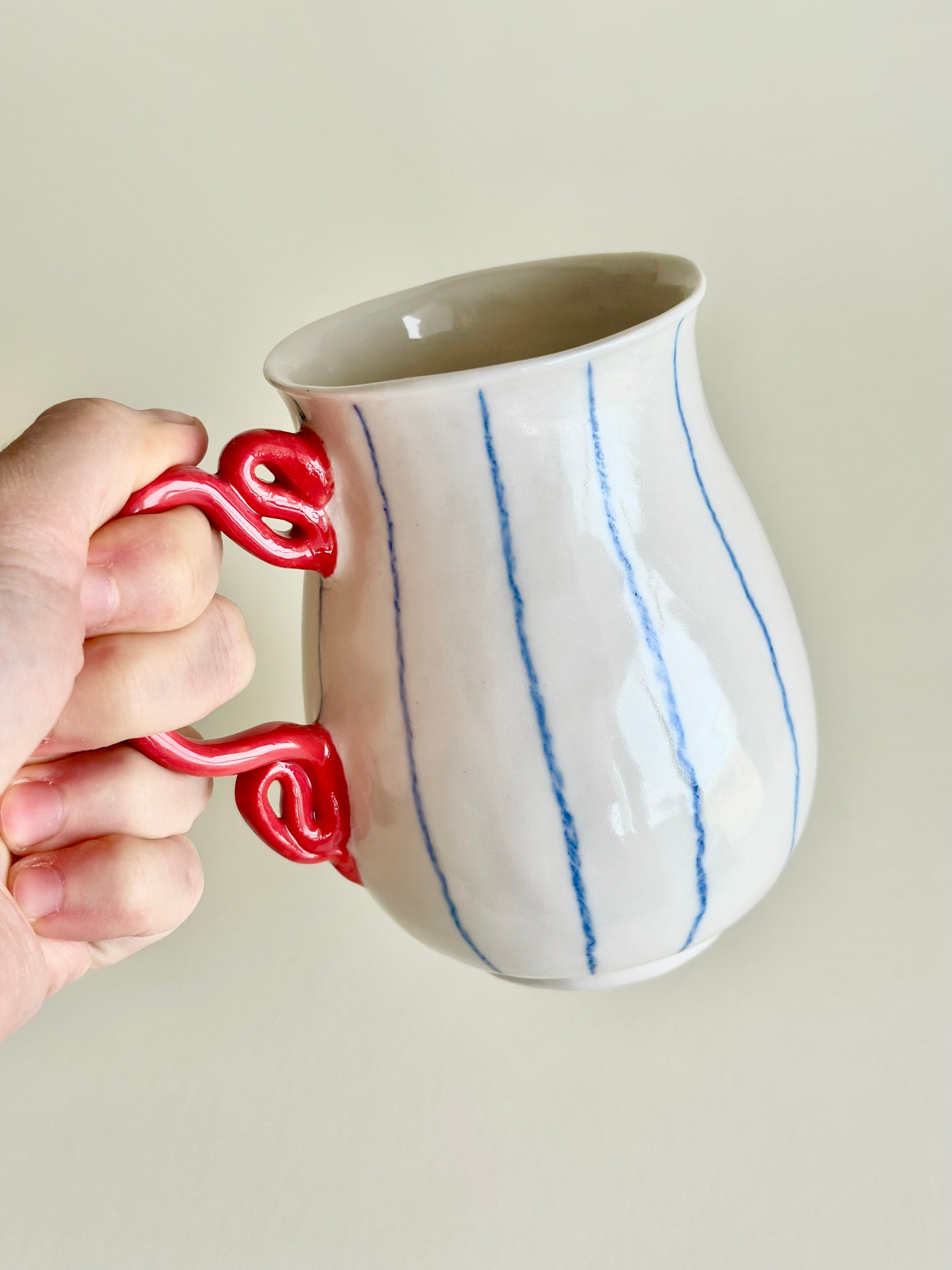 Unikatowy porcelanowy kubek o klasycznym kształcie z minimalistyczną dekoracją w postaci pionowych niebieskich kresek oraz nietypowego ucha o kontrastowym czerwonym kolorze. Idealny dla miłośników nietypowych połączeń.
