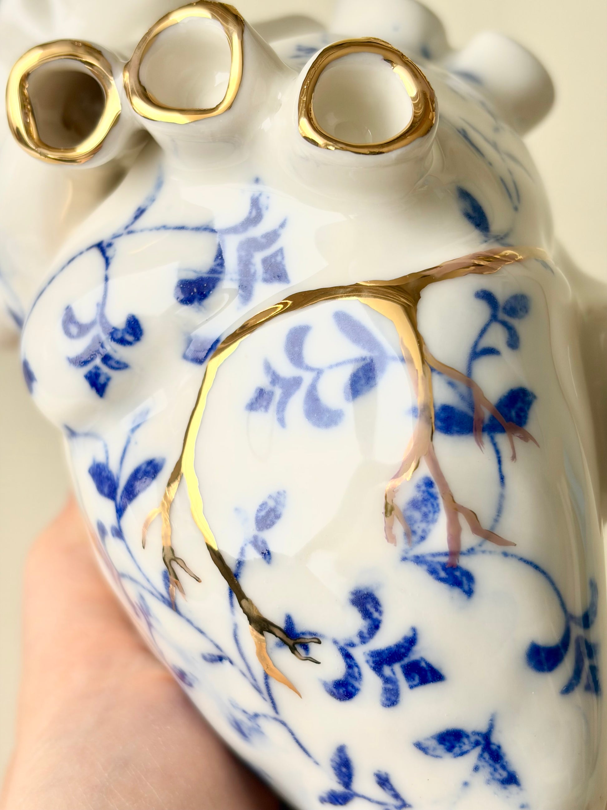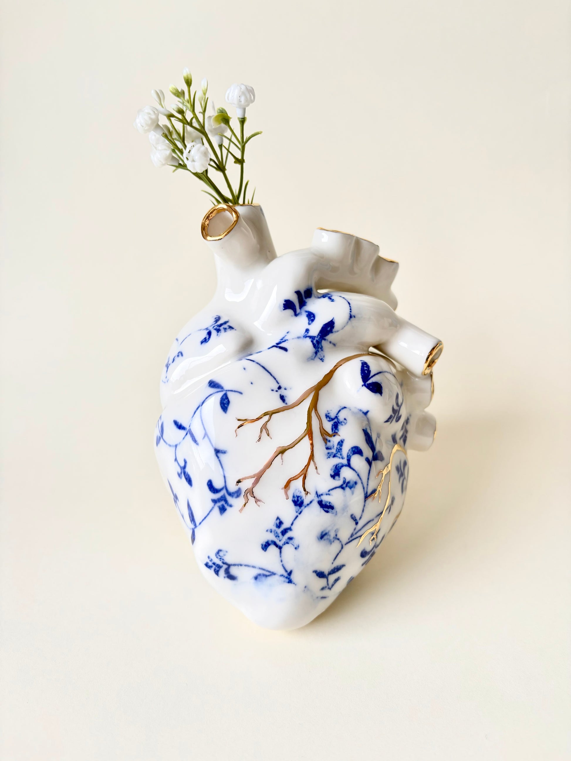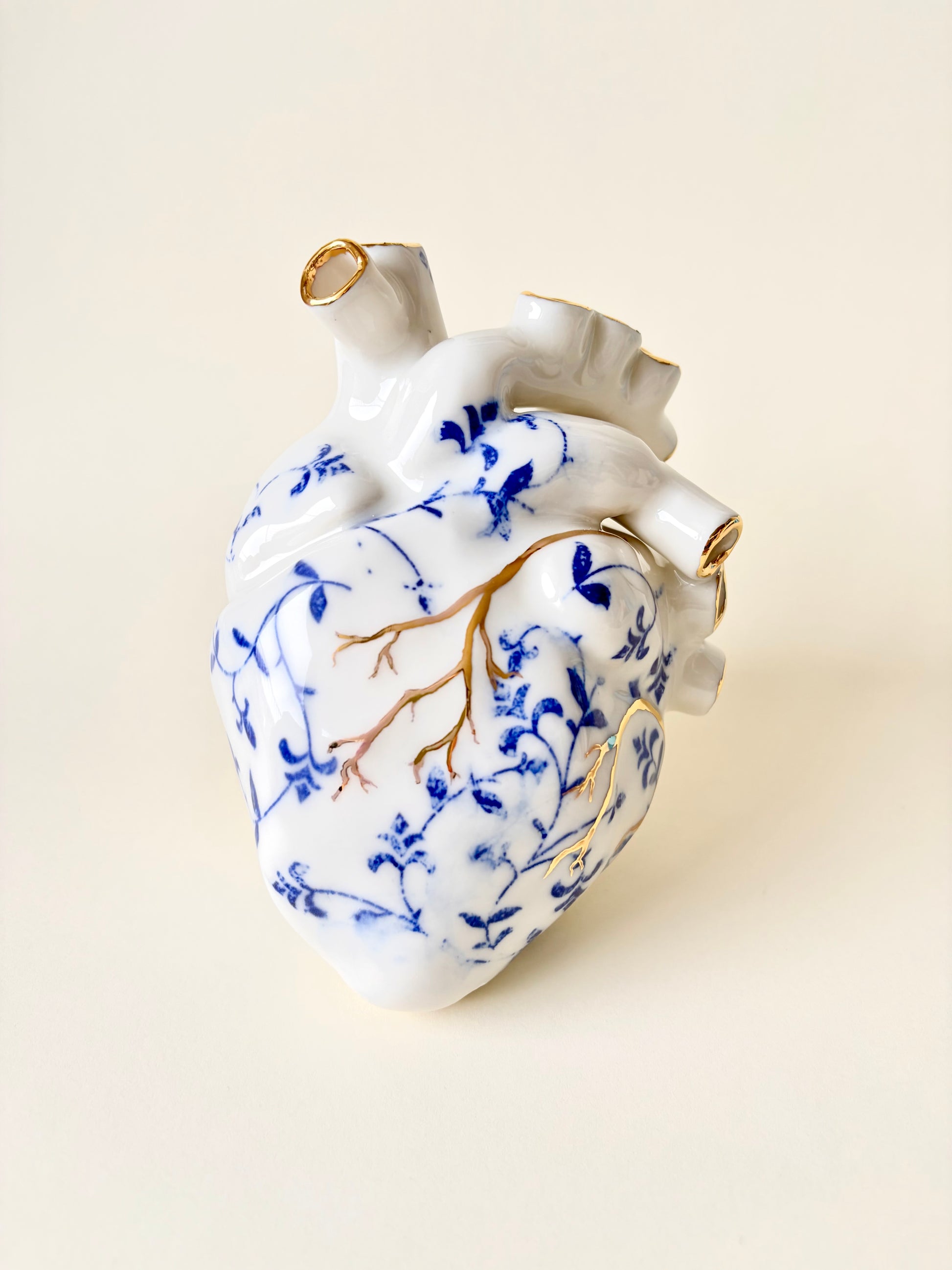 Ręcznie robione porcelanowe serce, zdobione kobaltowymi wzorami oraz subtelnymi, złoconymi detalami. Wnętrze serca zostało pokryte szkliwem, a w „żyłach” znajdują się jeden lub kilka otworów, dzięki czemu obiekt może pełnić nie tylko funkcję dekoracyjną, lecz także użytkową – jako nietypowy wazon na pojedyncze kwiaty lub drobne rośliny.