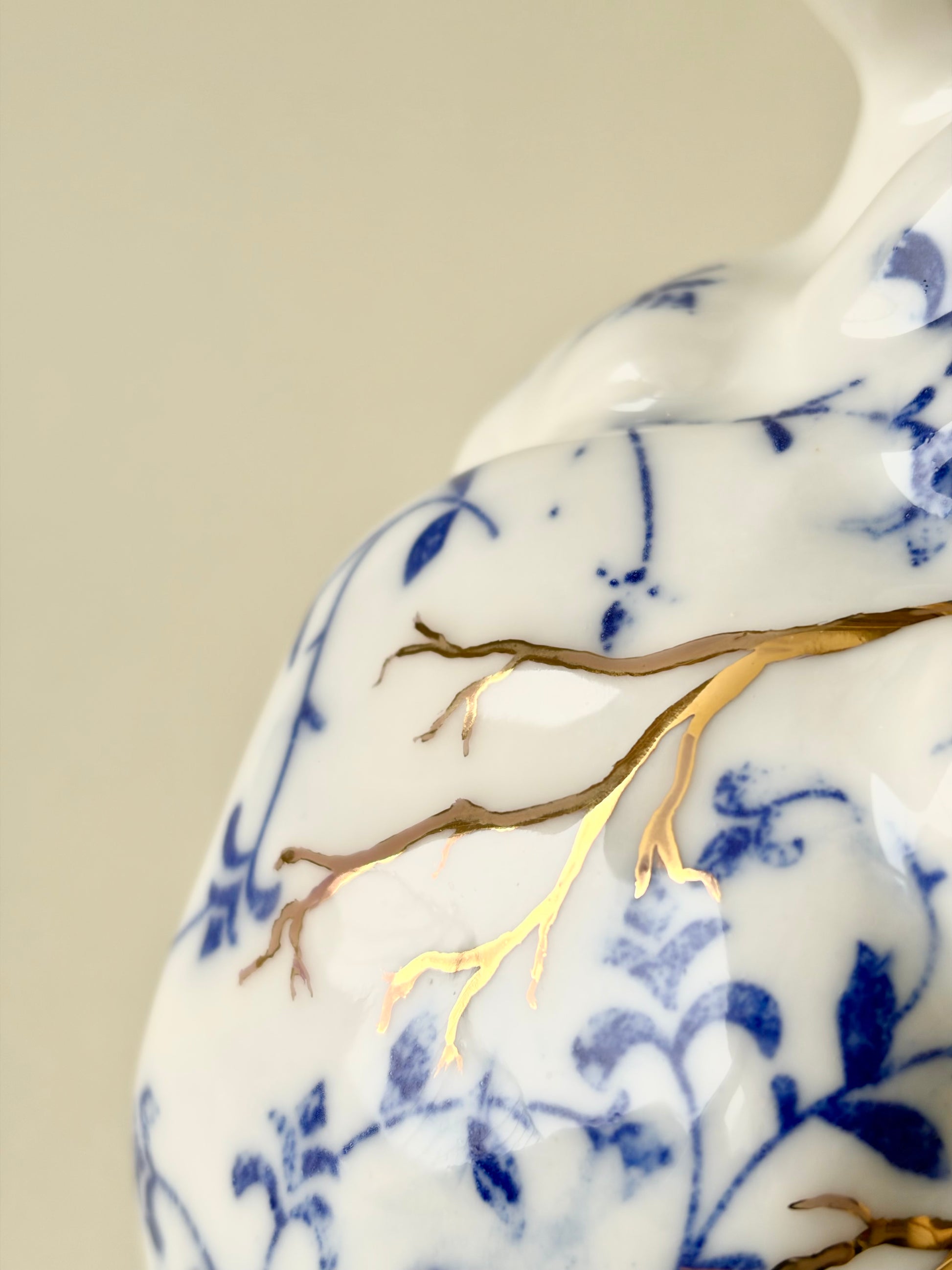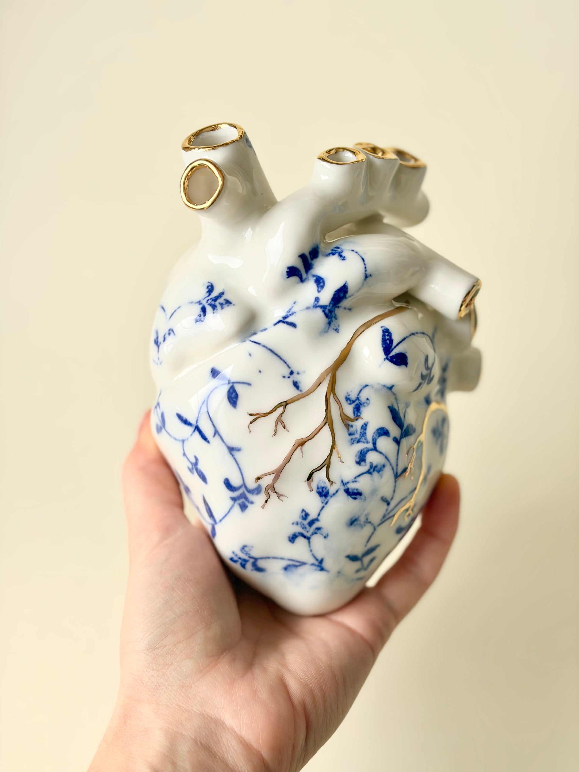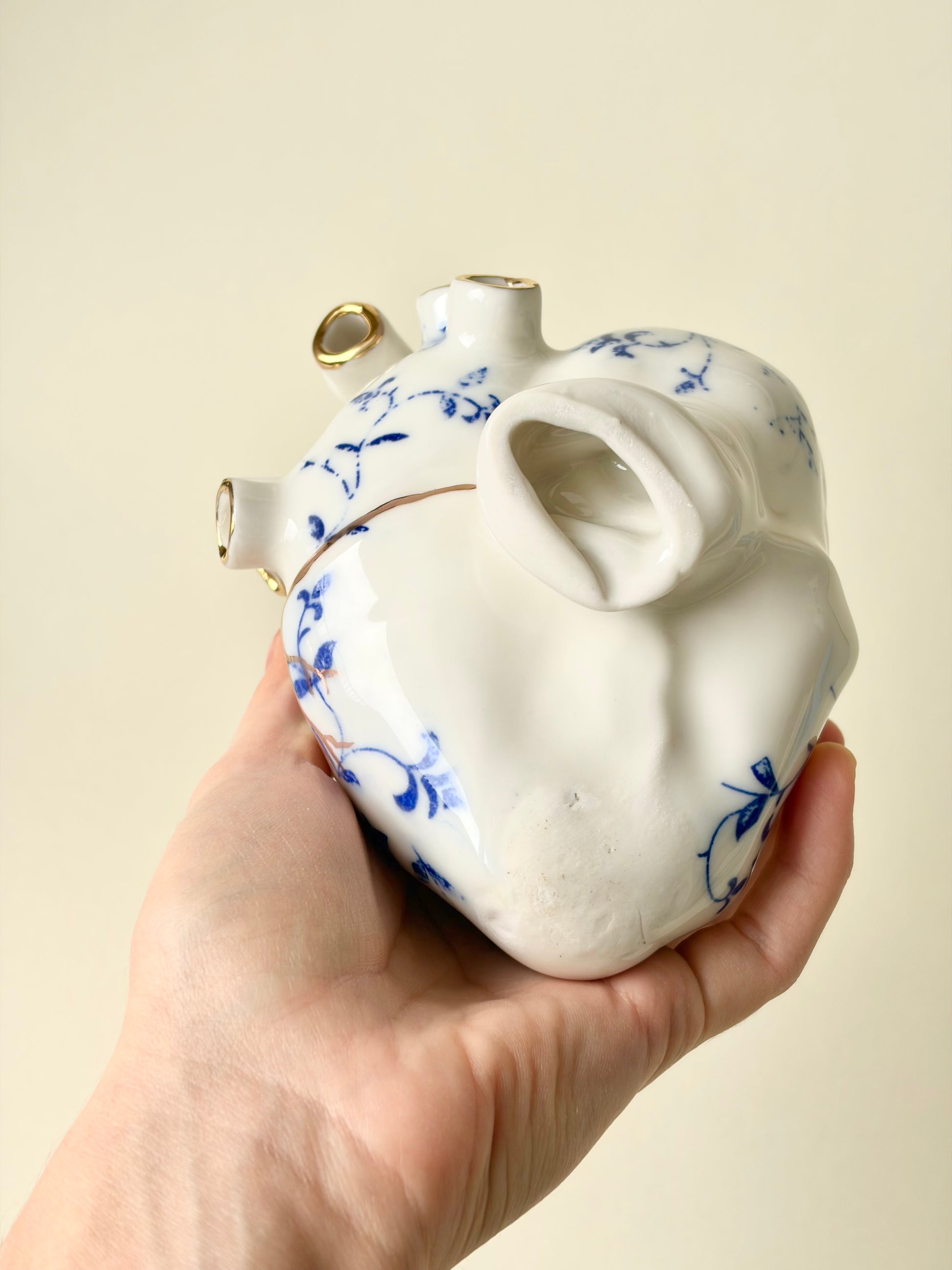 Ręcznie robione porcelanowe serce, zdobione kobaltowymi wzorami oraz subtelnymi, złoconymi detalami. Wnętrze serca zostało pokryte szkliwem, a w „żyłach” znajdują się jeden lub kilka otworów, dzięki czemu obiekt może pełnić nie tylko funkcję dekoracyjną, lecz także użytkową – jako nietypowy wazon na pojedyncze kwiaty lub drobne rośliny.