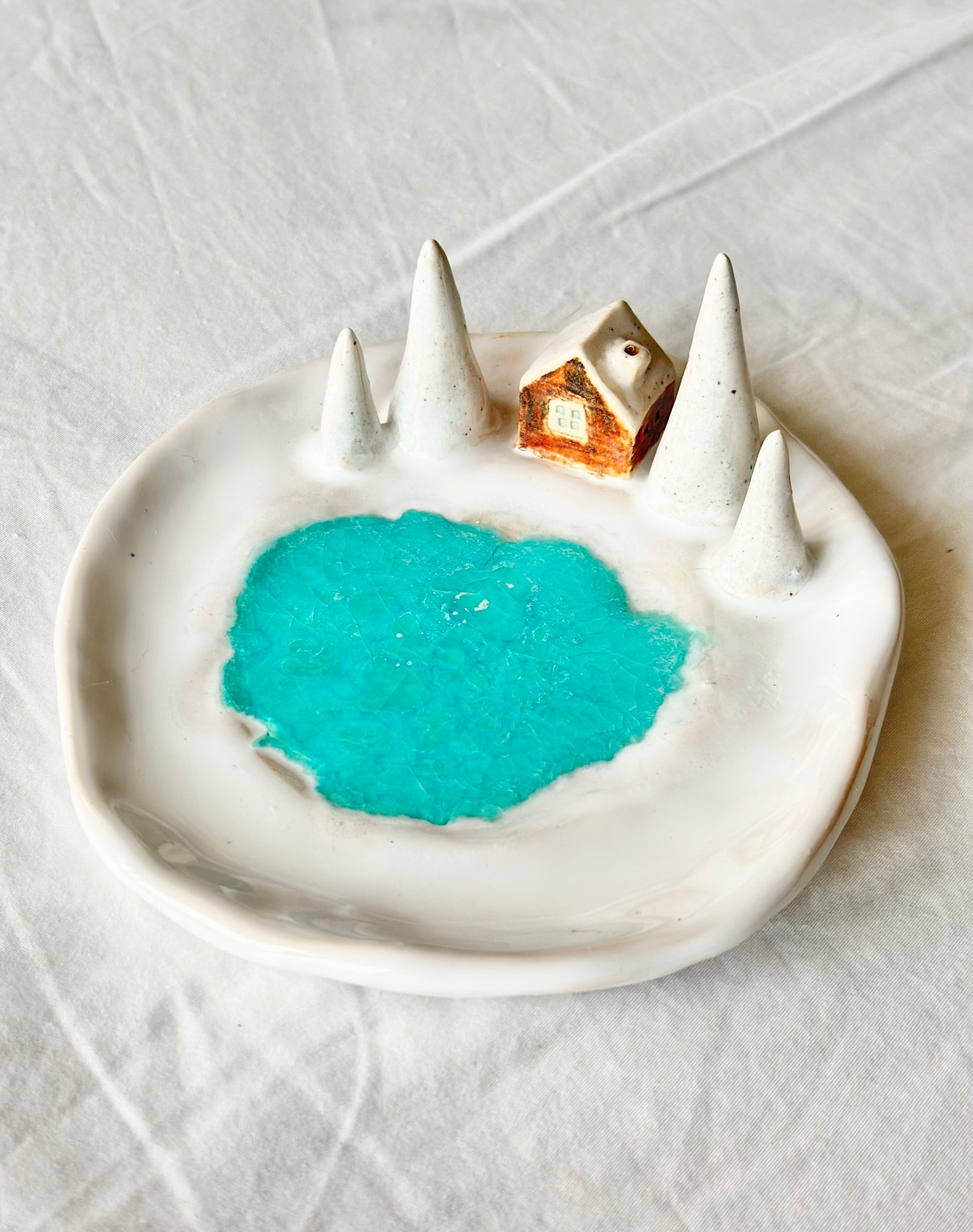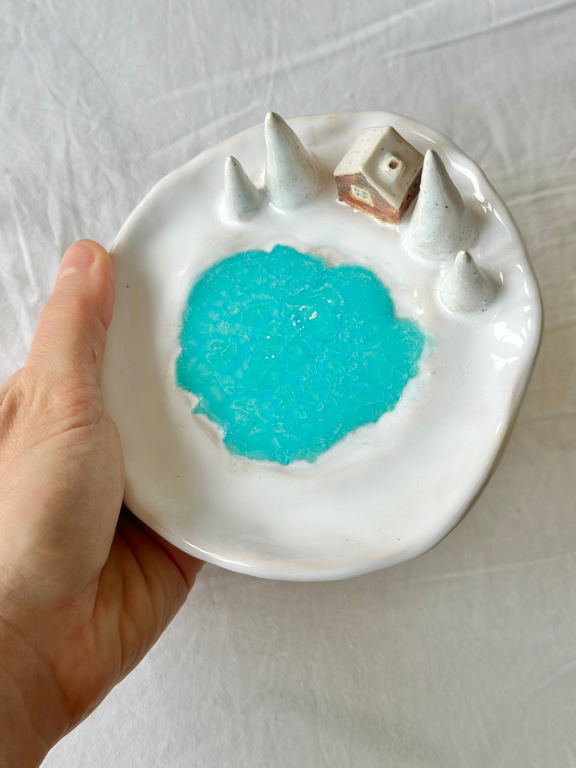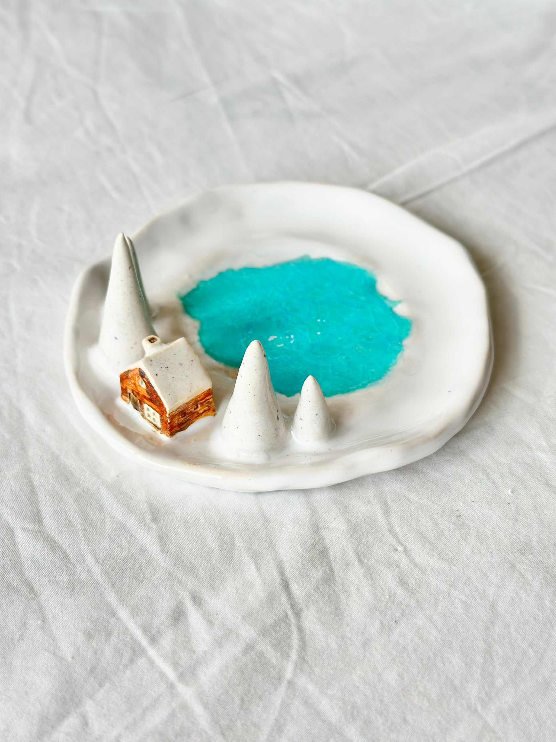 Ręcznie wykonany dekoracyjny talerzyk na drobiazgi, ozdobiony klimatycznym, trójwymiarowym pejzażem zimowym. Przedstawia zaśnieżony domek ukryty wśród smukłych jodeł, stojący nad zamarzniętym jeziorem.