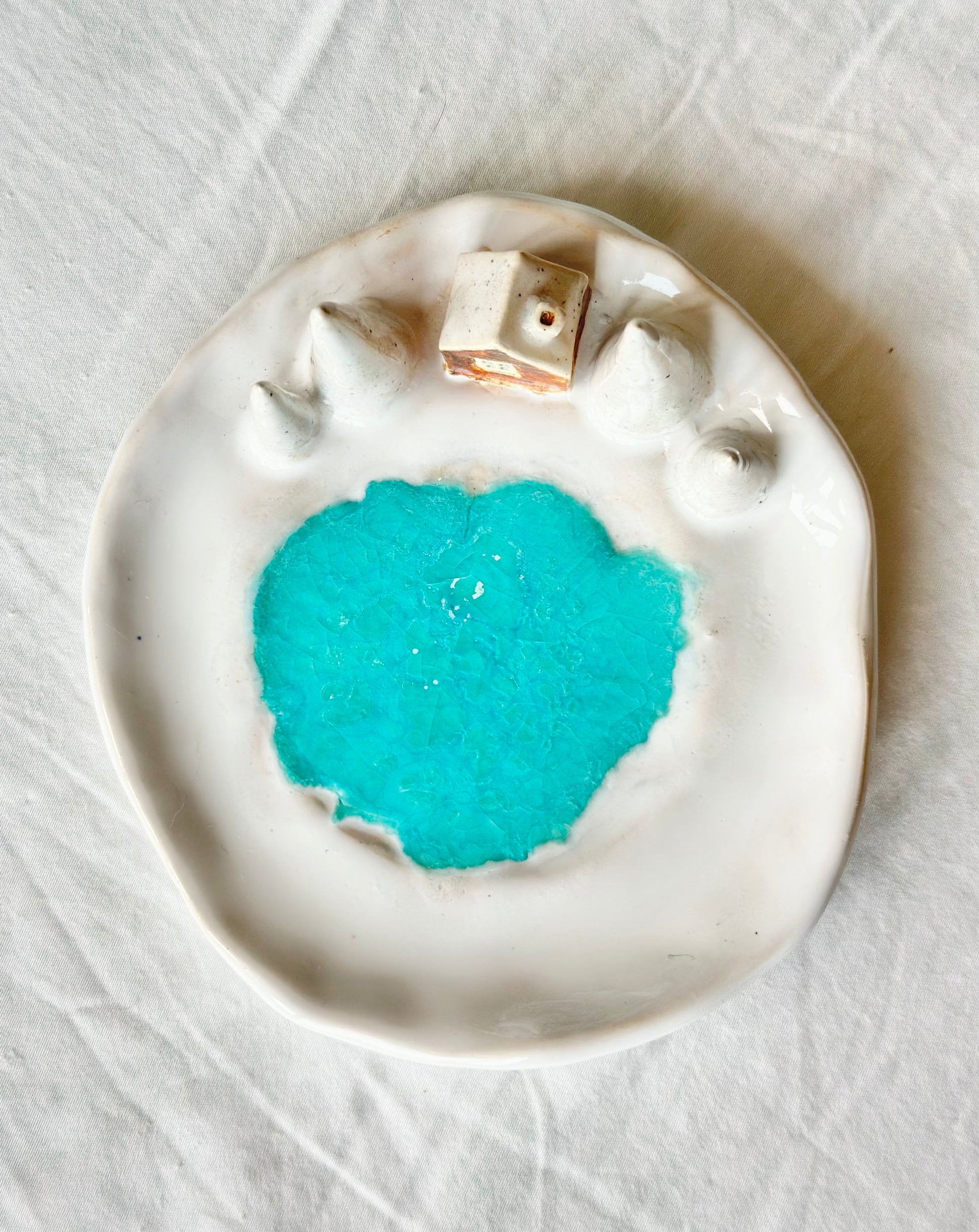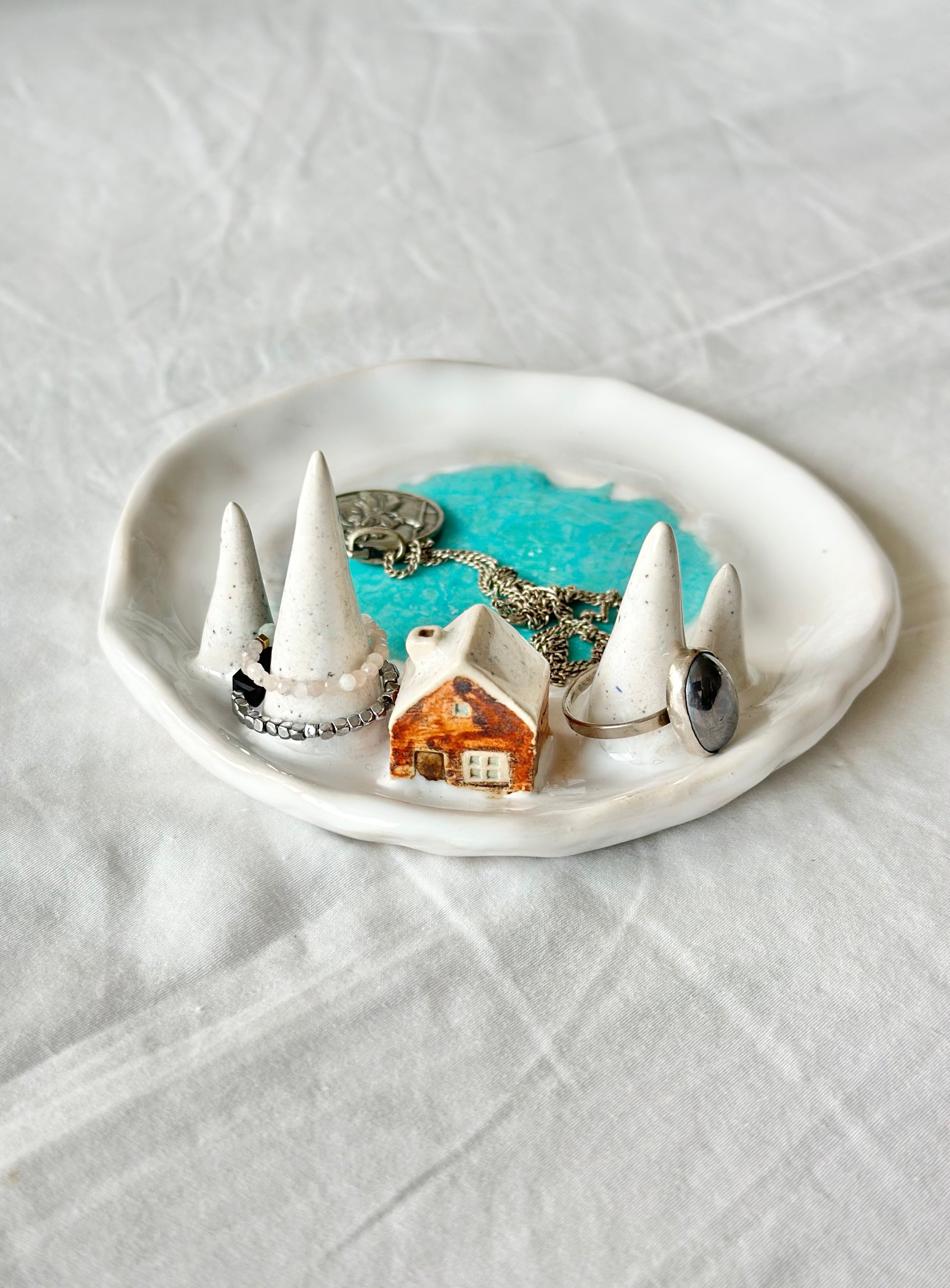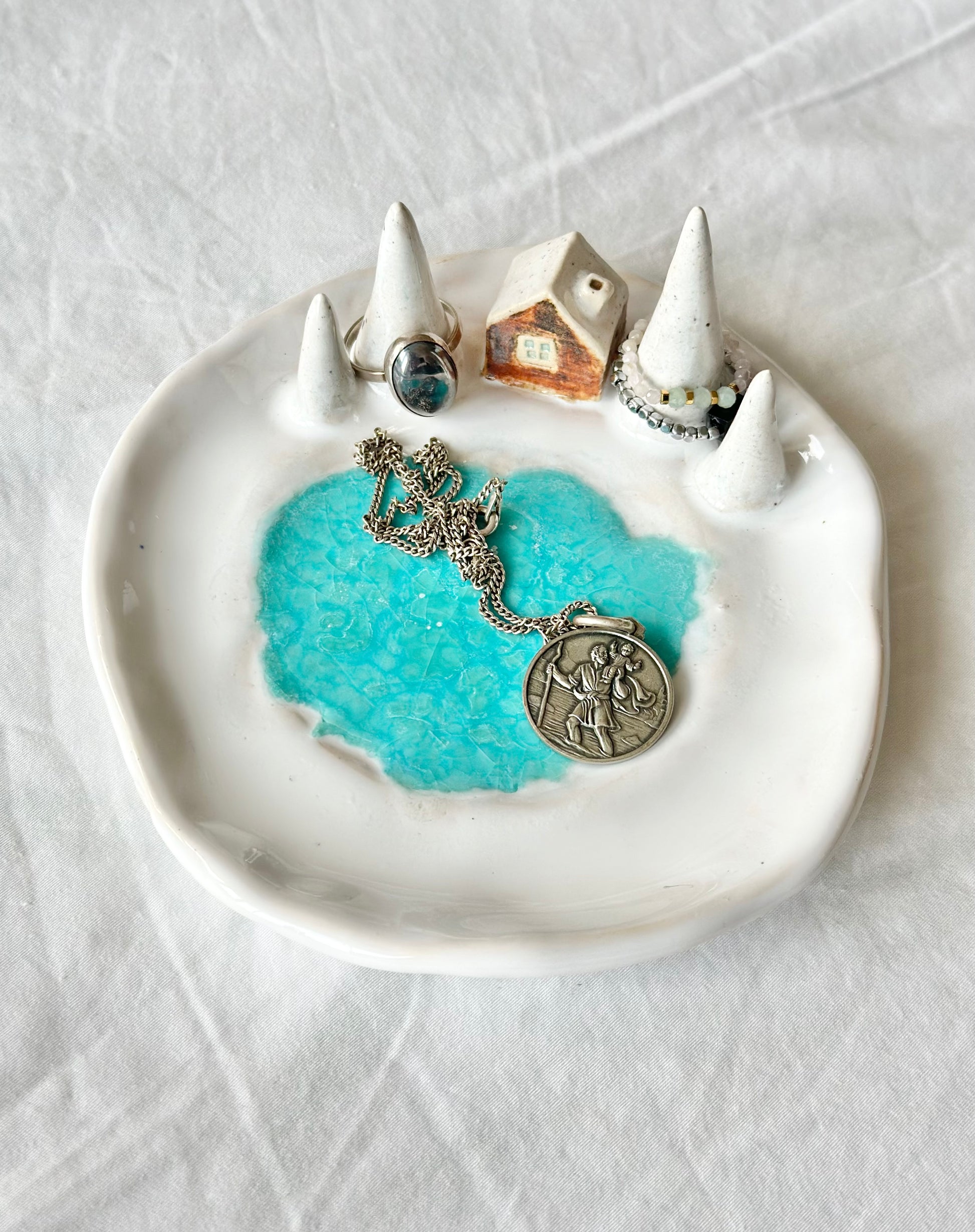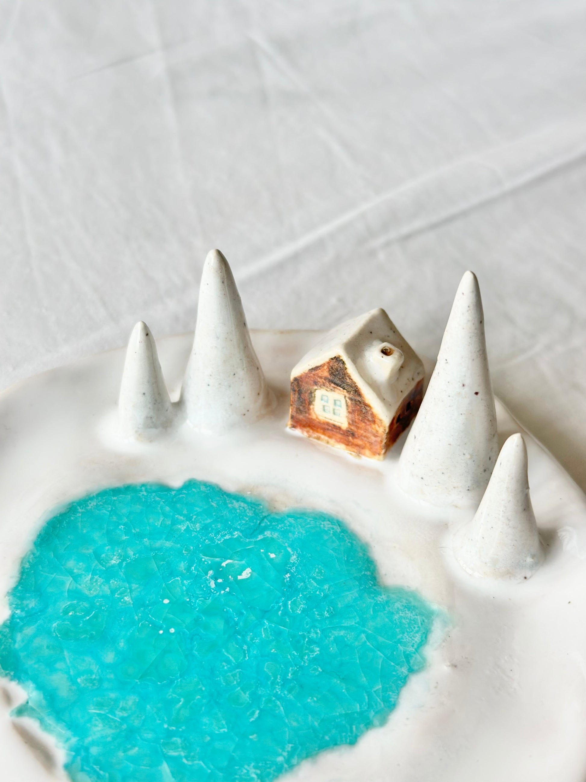 Ręcznie wykonany dekoracyjny talerzyk na drobiazgi, ozdobiony klimatycznym, trójwymiarowym pejzażem zimowym. Przedstawia zaśnieżony domek ukryty wśród smukłych jodeł, stojący nad zamarzniętym jeziorem.
