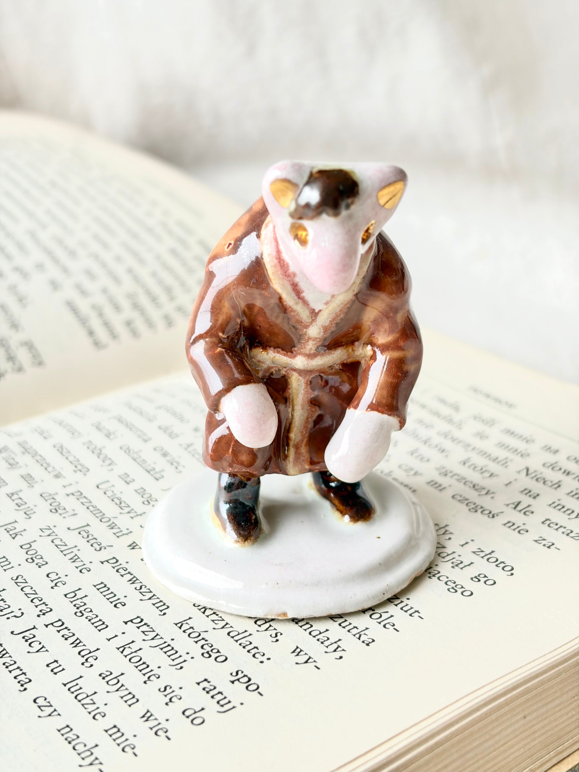 Unikatowa ceramiczna figurka przedstawiająca postać potężnego garbusa w brązowym kaftanie. Figurka jest dekorowana subtelnymi złoconymi elementami. Idealny upominek dla fanów gier fantasy i światów pełnych przygód.