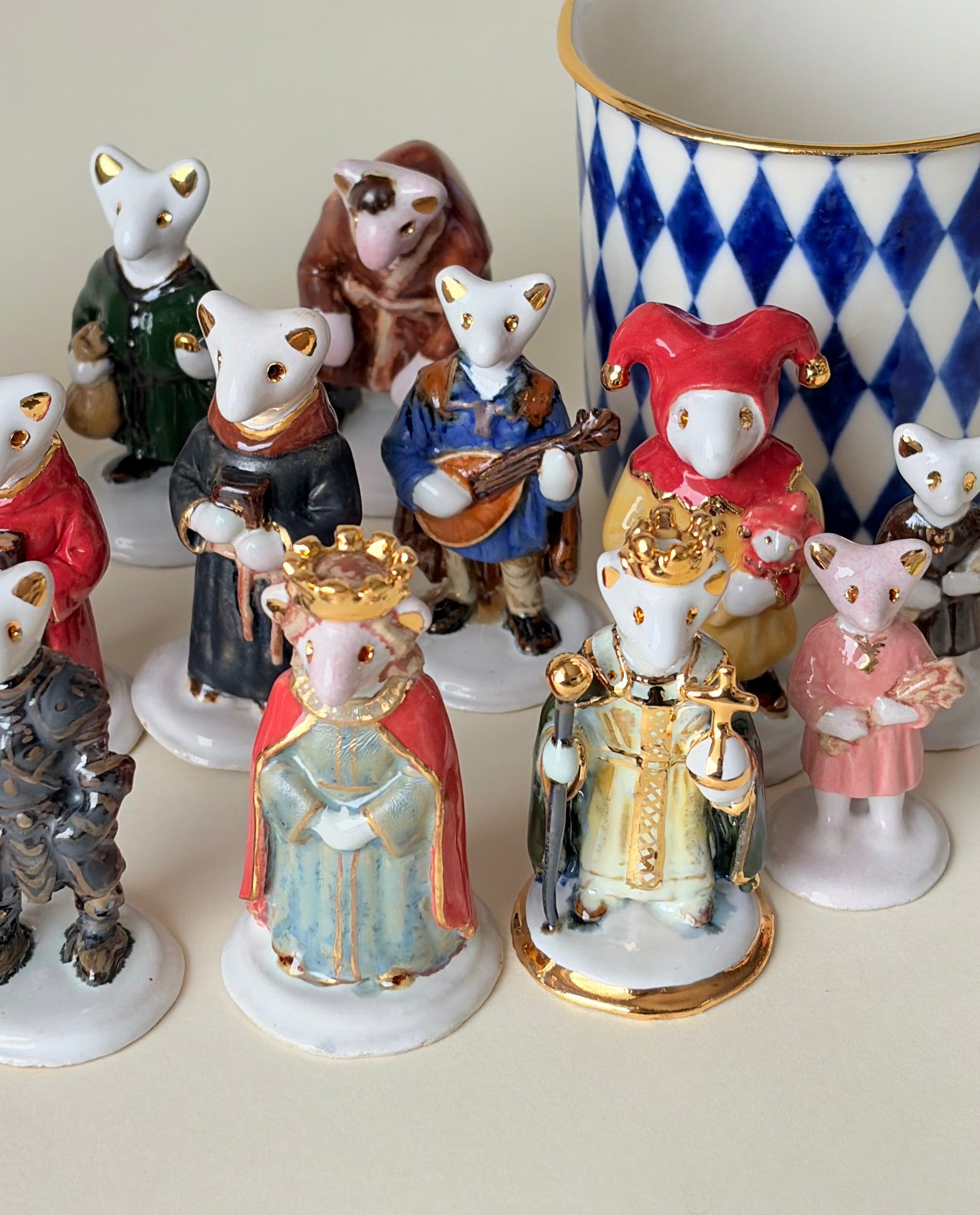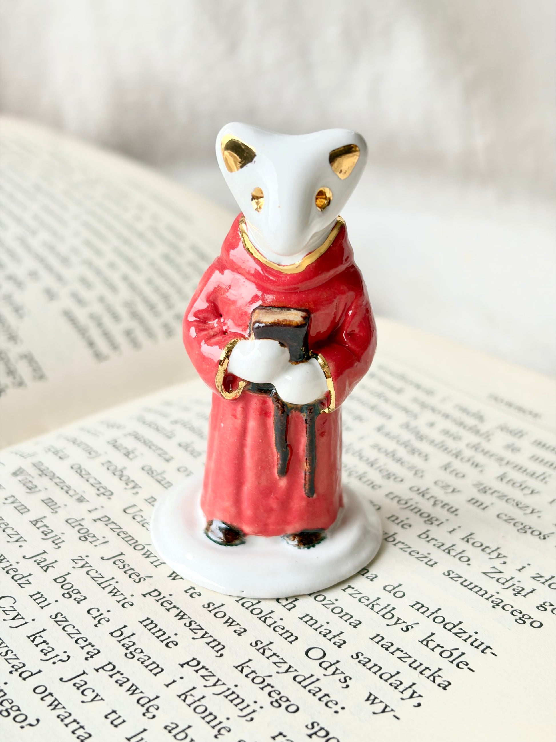 Unikatowa ceramiczna figurka przedstawiająca postać mnicha w czerwonym habicie. Figurka jest dekorowana subtelnymi złoconymi elementami. Idealny upominek dla fanów gier fantasy i światów pełnych przygód.